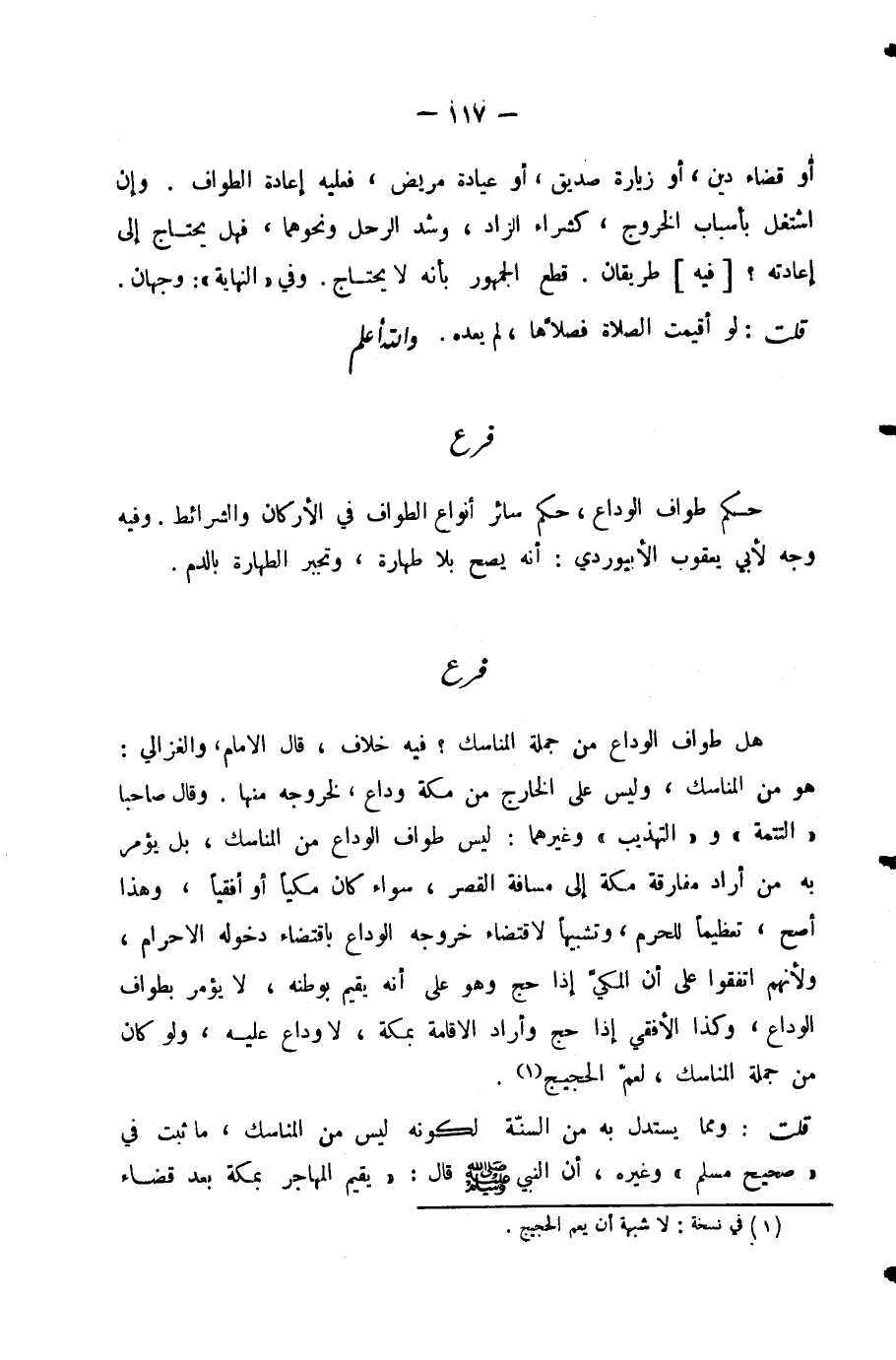 هَلْ طَوَافُ الْوَدَاعِ مِنْ جُمْلَةِ الْمَنَاسِكِ؟ فِيهِ خِلَافٌ، قَالَ الْإِمَامُ، وَالْغَزَالِيُّ: هُوَ مِنَ الْمَنَاسِكِ، وَلَيْسَ عَلَى الْخَارِجِ مِنْ مَكَّةَ وَدَاعٌ لِخُرُوجِهِ مِنْهَا. وَقَالَ صَاحِبَا «التَّتِمَّةِ» وَ «التَّهْذِيبِ» وَغَيْرُهُمَا: لَيْسَ طَوَافُ الْوَدَاعِ مِنَ الْمَنَاسِكِ، بَلْ يُؤْمَرُ بِهِ مَنْ أَرَادَ مُفَارَقَةَ مَكَّةَ إِلَى مَسَافَةِ الْقَصْرِ، سَوَاءٌ كَانَ مَكِّيًّا أَوْ أُفُقِيًّا، وَهَذَا أَصَحُّ؛ تَعْظِيمًا لِلْحَرَمِ، وَتَشْبِيهًا لِاقْتِضَاءِ خُرُوجِهِ الْوَدَاعَ بِاقْتِضَاءِ دُخُولِهِ الْإِحْرَامَ؛ وَلِأَنَّهُمُ اتَّفَقُوا عَلَى أَنَّ الْمَكِّيَّ إِذَا حَجَّ وَهُوَ عَلَى أَنَّهُ يُقِيمُ بِوَطَنِهِ، لَا يُؤْمَرُ بِطَوَافِ الْوَدَاعِ، وَكَذَا الْأُفُقِيُّ إِذَا حَجَّ وَأَرَادَ الْإِقَامَةَ بِمَكَّةَ، لَا وَدَاعَ عَلَيْهِ، وَلَوْ كَانَ مِنْ جُمْلَةِ الْمَنَاسِكِ، لَعَمَّ الْحَجِيجَ.