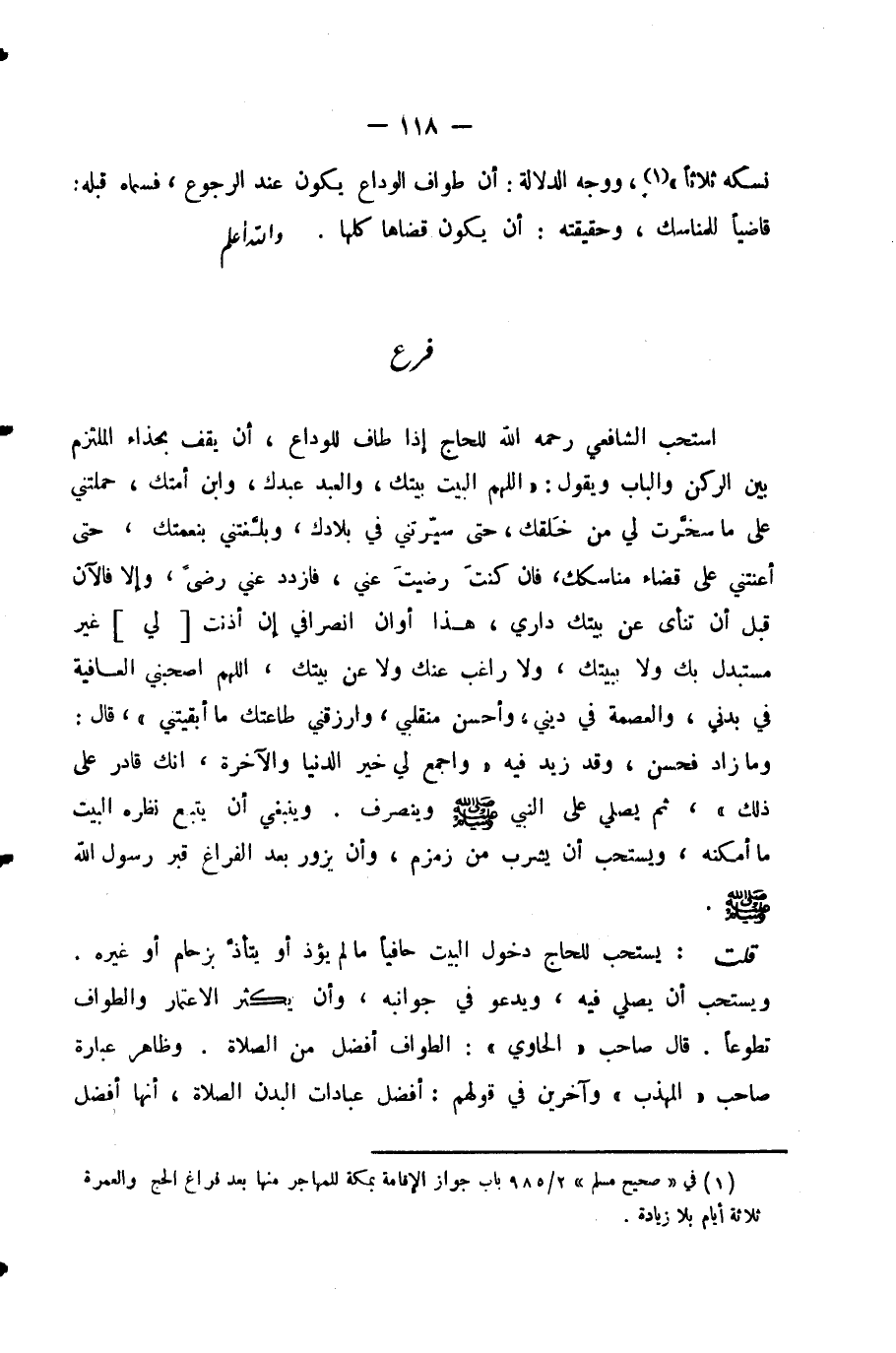 نُسُكِهِ ثَلَاثًا» ، وَوَجْهُ الدَّلَالَةِ: أَنَّ طَوَافَ الْوَدَاعِ يَكُونُ عِنْدَ الرُّجُوعِ، فَسَمَّاهُ قَبْلَهُ: قَاضِيًا لِلْمَنَاسِكِ، وَحَقِيقَتُهُ: أَنْ يَكُونَ قَضَاهَا كُلَّهَا. - وَاللَّهُ أَعْلَمُ -.