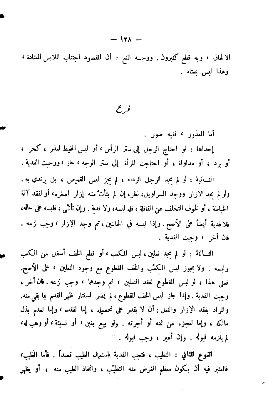 أَمَّا الْمَعْذُورُ فَفِيهِ صُوَرٌ. إِحْدَاهَا: لَوِ احْتَاجَ الرَّجُلُ إِلَى سَتْرِ الرَّأْسِ، أَوْ لُبْسِ الْمَخِيطِ لَعُذْرٍ، كَحَرٍّ، أَوْ بَرْدٍ، أَوْ مُدَاوَاةٍ، أَوِ احْتَاجَتِ الْمَرْأَةُ إِلَى سَتْرِ الْوَجْهِ جَازَ وَوَجَبَتِ الْفِدْيَةُ. الثَّانِيَةُ: لَوْ لَمْ يَجِدِ الرَّجُلُ الرِّدَاءَ، لَمْ يَجُزْ لُبْسُ الْقَمِيصِ، بَلْ يَرْتَدِي بِهِ. وَلَوْ لَمْ يَجِدِ الْإِزَارَ وَوَجَدَ السَّرَاوِيلَ، نُظِرَ إِنْ لَمْ يَتَأَتَّ مِنْهُ إِزَارٌ لِصِغَرِهِ، أَوْ لِفَقْدِ آلَةِ الْخِيَاطَةِ، أَوْ لِخَوْفِ التَّخَلُّفِ عَنِ الْقَافِلَةِ، فَلَهُ لُبْسُهُ، وَلَا فِدْيَةَ. وَإِنْ تَأَتَّى، فَلَبِسَهُ عَلَى حَالِهِ، فَلَا فِدْيَةَ أَيْضًا عَلَى الْأَصَحِّ. وَإِذَا لَبِسَهُ فِي الْحَالَتَيْنِ، ثُمَّ وَجَدَ الْإِزَارَ، وَجَبَ نَزْعُهُ. فَإِنْ أَخَّرَ، وَجَبَتِ الْفِدْيَةُ.