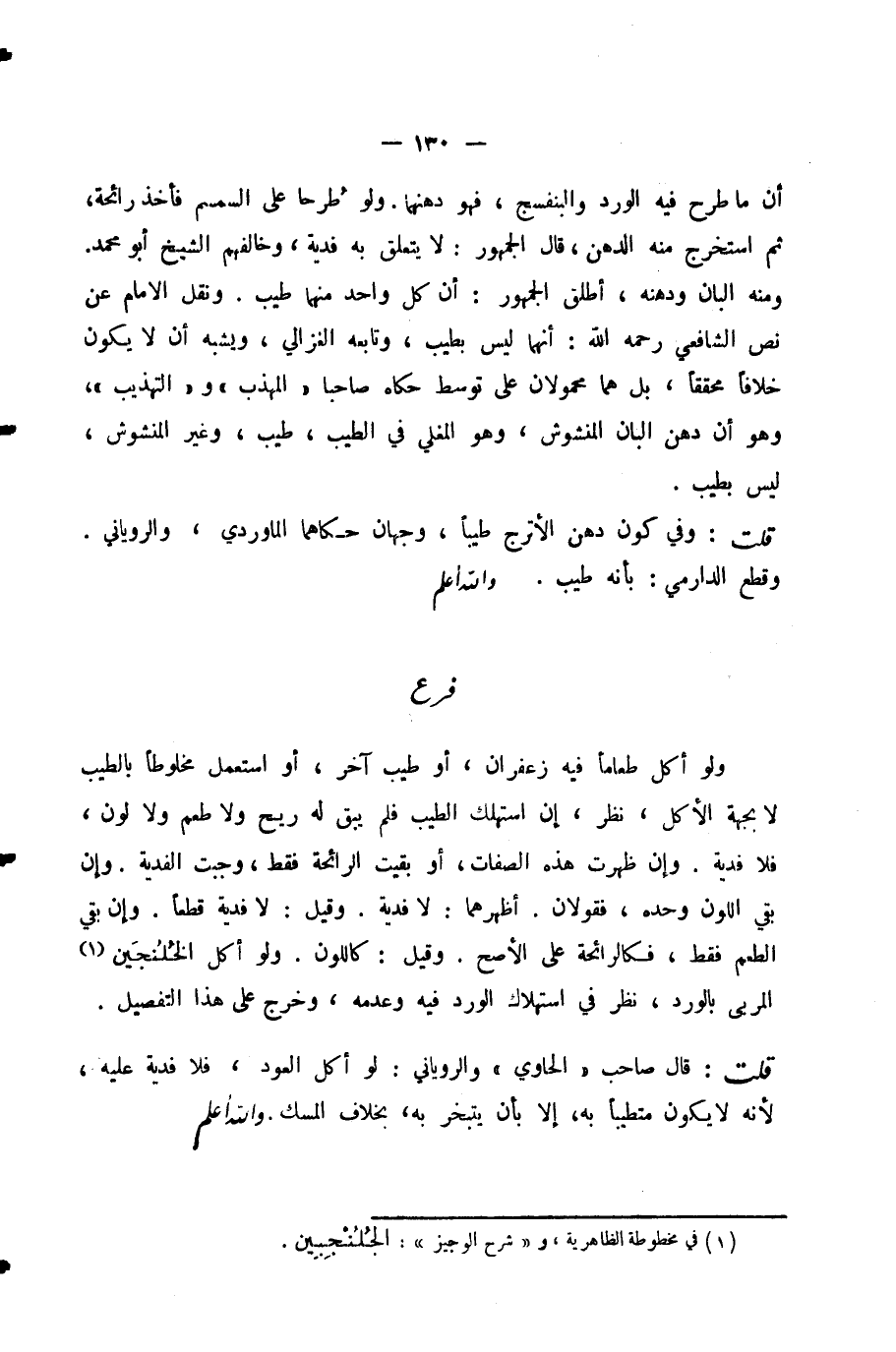 قُلْتُ: وَفِي كَوْنِ دُهْنِ الْأُتْرُجِّ طِيبًا، وَجْهَانِ حَكَاهُمَا الْمَاوَرْدِيُّ، وَالرُّويَانِيُّ. وَقَطَعَ الدَّارِمِيُّ: بِأَنَّهُ طِيبٌ. - وَاللَّهُ أَعْلَمُ -.
