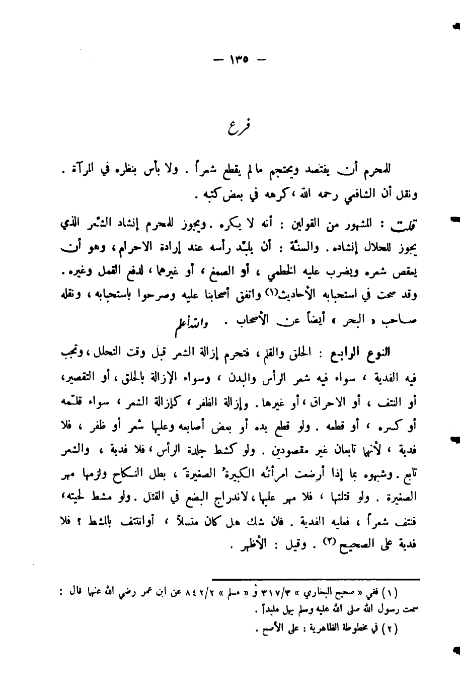 النَّوْعُ الرَّابِعُ: الْحَلْقُ وَالْقَلْمُ، فَتَحْرُمُ إِزَالَةُ الشَّعْرِ قَبْلَ وَقْتِ التَّحَلُّلِ، وَتَجِبُ فِيهِ الْفِدْيَةُ، سَوَاءٌ فِيهِ شَعْرُ الرَّأْسِ وَالْبَدَنِ، وَسَوَاءٌ الْإِزَالَةُ بِالْحَلْقِ أَوِ التَّقْصِيرِ أَوِ النَّتْفِ أَوِ الْإِحْرَاقِ أَوْ غَيْرِهَا. وَإِزَالَةُ الظُّفْرِ كَإِزَالَةِ الشَّعْرِ سَوَاءٌ قَلَّمَهُ أَوْ كَسَرَهُ، أَوْ قَطَعَهُ. وَلَوْ قَطَعَ يَدَهُ أَوْ بَعْضَ أَصَابِعِهِ وَعَلَيْهَا شَعْرٌ أَوْ ظُفْرٌ فَلَا فِدْيَةَ؛ لِأَنَّهُمَا تَابِعَانِ غَيْرُ مَقْصُودَيْنِ. وَلَوْ كَشَطَ جِلْدَةَ الرَّأْسِ فَلَا فِدْيَةَ، وَالشَّعْرُ تَابِعٌ. وَشَبَّهُوهُ بِمَا إِذَا أَرْضَعَتِ امْرَأَتُهُ الْكَبِيرَةُ الصَّغِيرَةَ، بَطَلَ النِّكَاحُ وَلَزِمَهَا مَهْرُ الصَّغِيرَةِ. وَلَوْ قَتَلَتْهَا، فَلَا مَهْرَ عَلَيْهَا لِانْدِرَاجِ الْبِضْعِ فِي الْقَتْلِ. وَلَوْ مَشَّطَ لِحْيَتَهُ، فَنَتَفَ شَعْرًا، فَعَلَيْهِ الْفِدْيَةُ. فَإِنْ شَكَّ هَلْ كَانَ مُنْسَلًّا، أَوِ انْتُتِفَ بِالْمُشْطِ؟ فَلَا فِدْيَةَ عَلَى الصَّحِيحِ. وَقِيلَ: الْأَظْهَرُ.