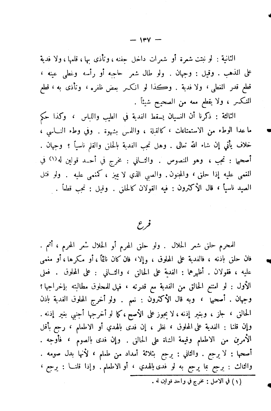 الثَّالِثَةُ: ذَكَرْنَا أَنَّ النِّسْيَانَ يُسْقِطُ الْفِدْيَةَ فِي الطِّيبِ وَاللِّبَاسِ، وَكَذَا حُكْمُ مَا عَدَا الْوَطْءَ مِنَ الِاسْتِمْتَاعَاتِ، كَالْقُبْلَةِ وَاللَّمْسَ بِشَهْوَةٍ. وَفِي وَطْءِ النَّاسِي، خِلَافٌ يَأْتِي إِنْ شَاءَ اللَّهُ تَعَالَى. وَهَلْ تَجِبُ الْفِدْيَةُ بِالْحَلْقِ وَالْقَلْمِ نَاسِيًا؟ وَجْهَانِ.