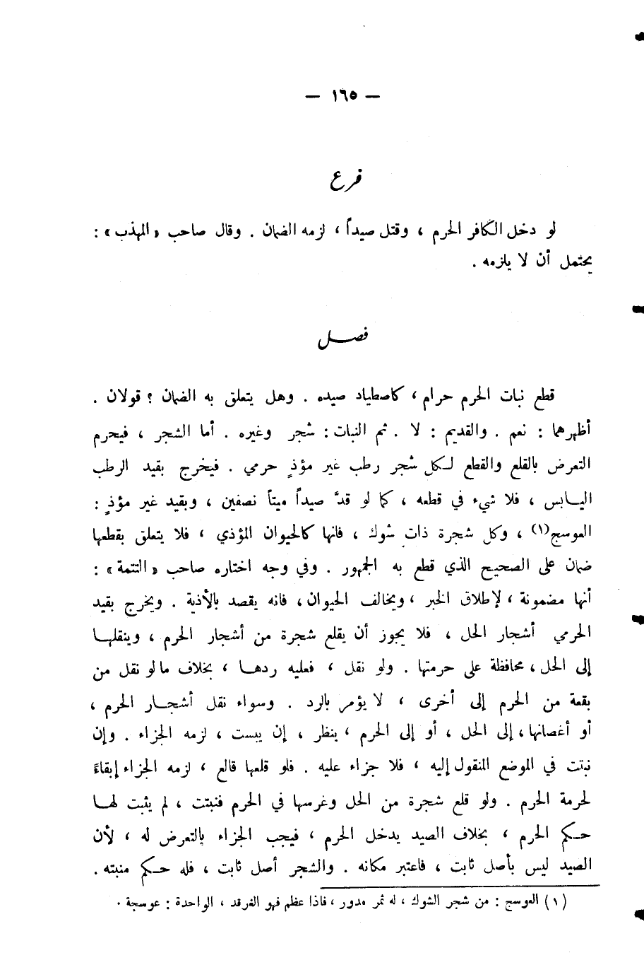 قَطْعُ نَبَاتِ الْحَرَمِ حَرَامٌ، كَاصْطِيَادِ صَيْدِهِ. وَهَلْ يَتَعَلَّقُ بِهِ الضَّمَانُ؟ قَوْلَانِ: أَظْهَرُهُمَا: نَعَمْ. وَالْقَدِيمُ: لَا. ثُمَّ النَّبَاتُ: شَجَرٌ وَغَيْرُهُ. أَمَّا الشَّجَرُ، فَيَحْرُمُ التَّعَرُّضُ بِالْقَلْعِ وَالْقَطْعِ لِكُلِّ شَجَرٍ رَطْبٍ غَيْرِ مُؤْذٍ حَرَمِيٍّ. فَيَخْرُجُ بِقَيْدِ الرَّطْبِ الْيَابِسُ، فَلَا شَيْءَ فِي قَطْعِهِ، كَمَا لَوْ قَدَّ صَيْدًا مَيِّتًا نِصْفَيْنِ. وَبِقَيْدٍ غَيْرِ مُؤْذٍ: الْعَوْسَجُ، وَكُلُّ شَجَرَةٍ ذَاتِ شَوْكٍ، فَإِنَّهَا كَالْحَيَوَانِ الْمُؤْذِي، فَلَا يَتَعَلَّقُ بِقَطْعِهَا ضَمَانٌ عَلَى الصَّحِيحِ الَّذِي قَطَعَ بِهِ الْجُمْهُورُ.