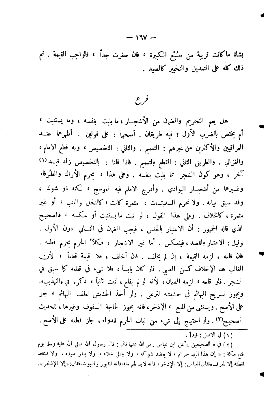 هَلْ يَعُمُّ التَّحْرِيمُ وَالضَّمَانُ مِنَ الْأَشْجَارِ، مَا يَنْبُتُ بِنَفْسِهِ، وَمَا يَسْتَنْبِتُ، أَمْ يَخْتَصُّ بِالضَّرْبِ الْأَوَّلِ؟ فِيهِ طَرِيقَانِ. أَصَحُّهُمَا: عَلَى قَوْلَيْنِ. أَظْهَرُهُمَا عِنْدَ الْعِرَاقِيِّينَ وَالْأَكْثَرِينَ مِنْ غَيْرِهِمْ: التَّعْمِيمُ. وَالثَّانِي: التَّخْصِيصُ، وَبِهِ قَطَعَ الْإِمَامُ، وَالْغَزَالِيُّ.