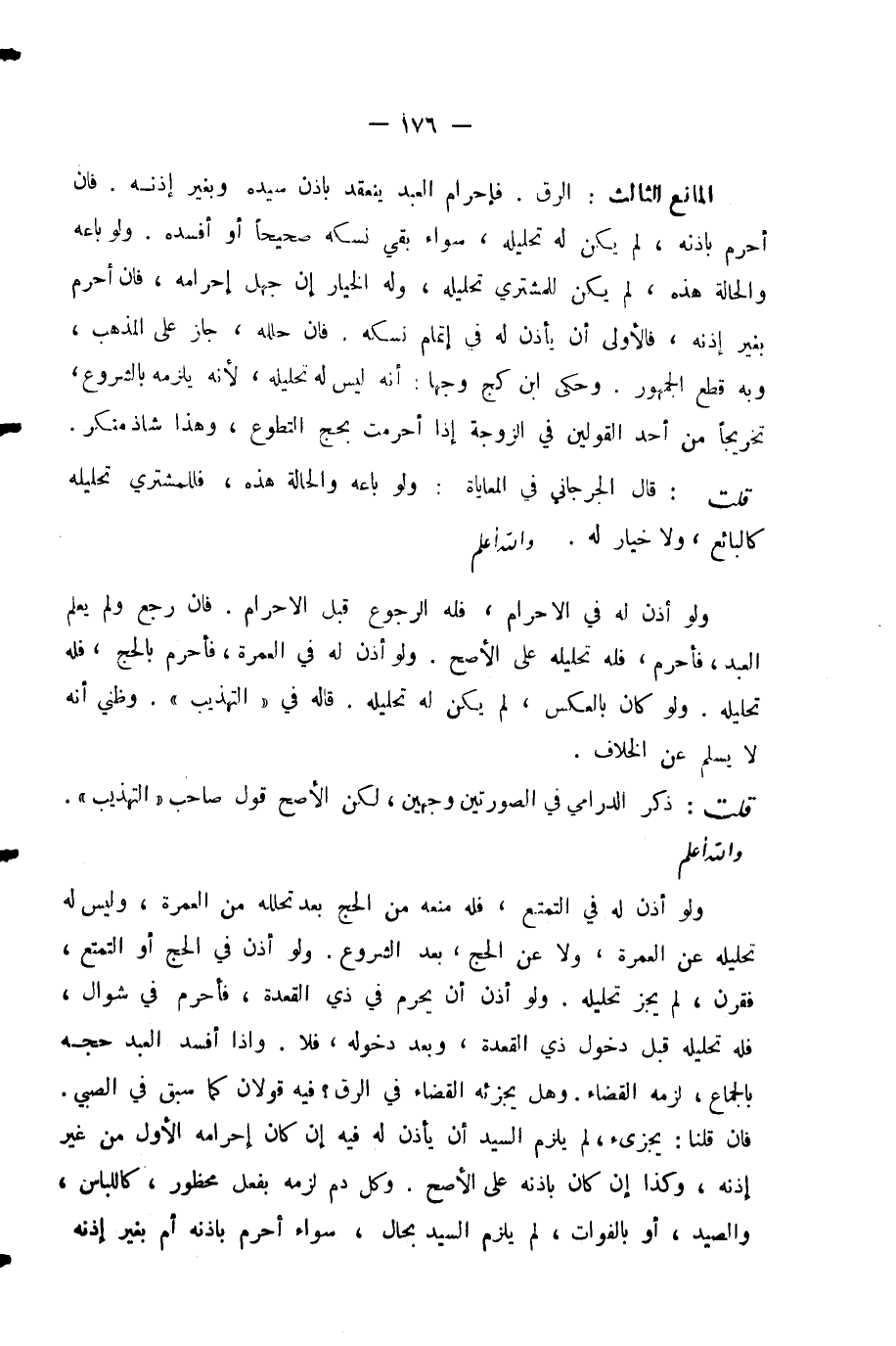 الْمَانِعُ الثَّالِثُ: الرِّقُّ. فَإِحْرَامُ الْعَبْدِ يَنْعَقِدُ بِإِذْنِ سَيِّدِهِ وَبِغَيْرِ إِذْنِهِ. فَإِنْ أَحْرَمَ بِإِذْنِهِ، لَمْ يَكُنْ لَهُ تَحْلِيلُهُ، سَوَاءً بَقِيَ نُسُكُهُ صَحِيحًا أَوْ أَفْسَدَهُ. وَلَوْ بَاعَهُ وَالْحَالَةُ هَذِهِ، لَمْ يَكُنْ لِلْمُشْتَرِي تَحْلِيلُهُ، وَلَهُ الْخِيَارُ إِنْ جَهِلَ إِحْرَامَهُ، فَإِنْ أَحْرَمَ بِغَيْرِ إِذْنِهِ، فَالْأَوْلَى أَنْ يَأْذَنَ لَهُ فِي إِتْمَامِ نُسُكِهِ. فَإِنْ حَلَّلَهُ، جَازَ عَلَى الْمَذْهَبِ، وَبِهِ قَطَعَ الْجُمْهُورُ. وَحَكَى ابْنُ كَجٍّ وَجْهًا: أَنَّهُ لَيْسَ لَهُ تَحْلِيلُهُ؛ لِأَنَّهُ يَلْزَمُهُ بِالشُّرُوعِ، تَخْرِيجًا مِنْ أَحَدِ الْقَوْلَيْنِ فِي الزَّوْجَةِ إِذَا أَحْرَمَتْ بِحَجِّ التَّطَوُّعِ، وَهَذَا شَاذٌّ مُنْكَرٌ.