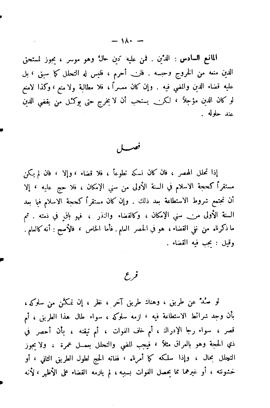 الْمَانِعُ السَّادِسُ: الدَّيْنُ. فَمَنْ عَلَيْهِ دَيْنٌ حَالٌّ وَهُوَ مُوسِرٌ، يَجُوزُ لِمُسْتَحِقِّ الدَّيْنِ مَنْعُهُ مِنَ الْخُرُوجِ وَحَبْسُهُ. فَإِنْ أَحْرَمَ، فَلَيْسَ لَهُ التَّحَلُّلُ كَمَا سَبَقَ، بَلْ عَلَيْهِ قَضَاءُ الدَّيْنِ وَالْمُضِيُّ فِيهِ. وَإِنْ كَانَ مُعْسِرًا، فَلَا مُطَالَبَةَ وَلَا مَنْعَ، وَكَذَا لَا مَنْعَ لَوْ كَانَ الدَّيْنُ مُؤَجَّلًا، لَكِنْ يُسْتَحَبُّ أَنْ لَا يَخْرُجَ حَتَّى يُوَكِّلَ مَنْ يَقْضِي الدَّيْنَ عِنْدَ حُلُولِهِ.