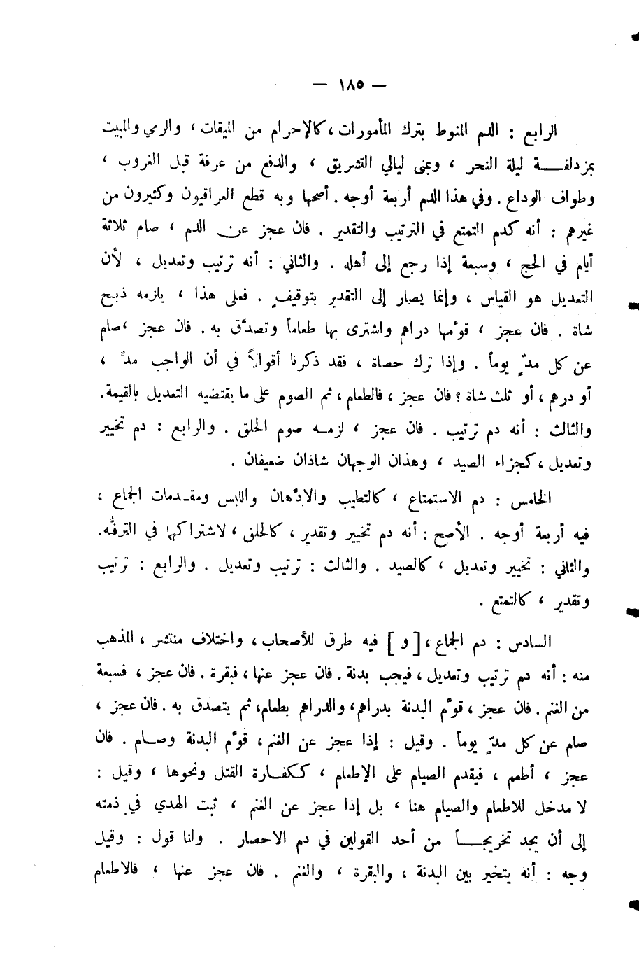 الرَّابِعُ: الدَّمُ الْمَنُوطُ بِتَرْكِ الْمَأْمُورَاتِ، كَالْإِحْرَامِ مِنَ الْمِيقَاتِ، وَالرَّمْيِ وَالْمَبِيتِ بِمُزْدَلِفَةَ لَيْلَةَ النَّحْرِ، وَبِمِنَى لَيَالِي التَّشْرِيقِ، وَالدَّفْعِ مِنْ عَرَفَةَ قَبْلَ الْغُرُوبِ، وَطَوَافِ الْوَدَاعِ. وَفِي هَذَا الدَّمِ أَرْبَعَةُ أَوْجُهٍ. أَصَحُّهَا وَبِهِ قَطَعَ الْعِرَاقِيُّونَ وَكَثِيرُونَ مِنْ غَيْرِهِمْ: أَنَّهُ كَدَمِ التَّمَتُّعِ فِي التَّرْتِيبِ وَالتَّقْدِيرِ. فَإِنْ عَجَزَ عَنِ الدَّمِ، صَامَ ثَلَاثَةَ أَيَّامٍ فِي الْحَجِّ، وَسَبْعَةً إِذَا رَجَعَ إِلَى أَهْلِهِ. وَالثَّانِي: أَنَّهُ تَرْتِيبٌ وَتَعْدِيلٌ؛ لِأَنَّ التَّعْدِيلَ هُوَ الْقِيَاسُ، وَإِنَّمَا يُصَارُ إِلَى التَّقْدِيرِ بِتَوْقِيفٍ. فَعَلَى هَذَا، يَلْزَمُهُ ذَبْحُ شَاةٍ. فَإِنْ عَجَزَ، قَوَّمَهَا دَرَاهِمَ وَاشْتَرَى بِهَا طَعَامًا وَتَصَدَّقَ بِهِ. فَإِنْ عَجَزَ، صَامَ عَنْ كُلِّ مُدٍّ يَوْمًا. وَإِذَا تَرَكَ حَصَاةً، فَقَدْ ذَكَرْنَا أَقْوَالًا فِي أَنَّ الْوَاجِبَ مُدٌّ، أَوْ دِرْهَمٌ، أَوْ ثُلُثُ شَاةٍ؟ فَإِنْ عَجَزَ، فَالطَّعَامُ، ثُمَّ الصَّوْمُ عَلَى مَا يَقْتَضِيهِ التَّعْدِيلُ بِالْقِيمَةِ. وَالثَّالِثُ: أَنَّهُ دَمُ تَرْتِيبٍ. فَإِنْ عَجَزَ، لَزِمَهُ صَوْمُ الْحَلْقِ. وَالرَّابِعُ: دَمُ تَخْيِيرٍ وَتَعْدِيلٍ، كَجَزَاءِ الصَّيْدِ، وَهَذَانِ الْوَجْهَانِ شَاذَّانِ ضَعِيفَانِ.