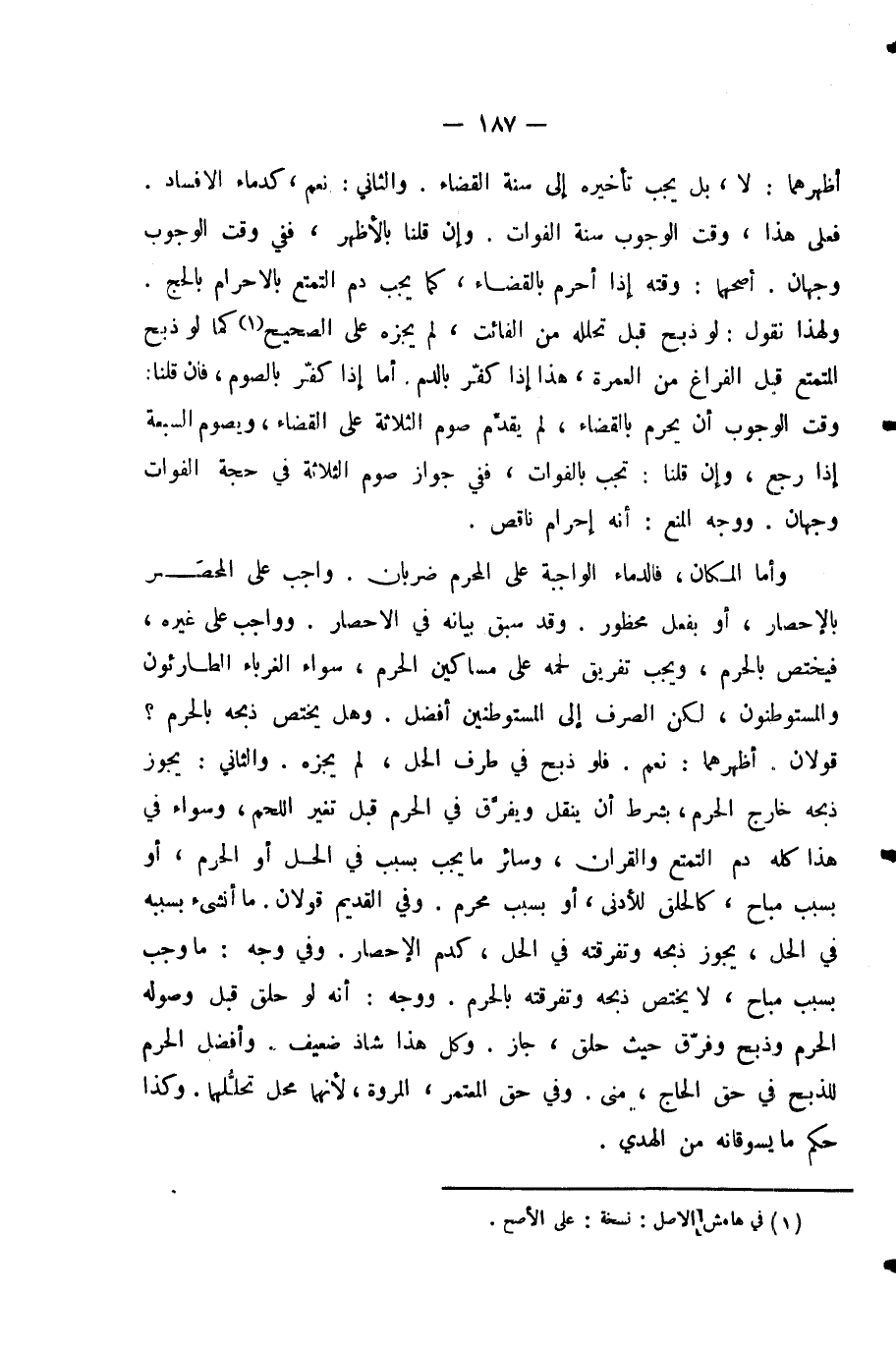 أَظْهَرُهُمَا: لَا، بَلْ يَجِبُ تَأْخِيرُهُ إِلَى سُنَّةِ الْقَضَاءِ. وَالثَّانِي، نَعَمْ، كَدِمَاءِ الْإِفْسَادِ. فَعَلَى هَذَا، وَقْتُ الْوُجُوبِ سُنَّةُ الْفَوَاتِ. وَإِنْ قُلْنَا بِالْأَظْهَرِ، فَفِي وَقْتِ الْوُجُوبِ وَجْهَانِ: أَصَحُّهُمَا: وَقَتُهُ إِذَا أَحْرَمَ بِالْقَضَاءِ، كَمَا يَجِبُ دَمُ التَّمَتُّعِ بِالْإِحْرَامِ بِالْحَجِّ. وَلِهَذَا نَقُولُ: لَوْ ذَبَحَ قَبْلَ تَحَلُّلِهِ مِنَ الْفَائِتِ، لَمْ يُجْزِهِ عَلَى الصَّحِيحِ كَمَا لَوْ ذَبَحَ الْمُتَمَتِّعُ قَبْلَ الْفَرَاغِ مِنَ الْعُمْرَةِ، هَذَا إِذَا كَفَّرَ بِالدَّمِ، أَمَّا إِذَا كَفَّرَ بِالصَّوْمِ، فَإِنْ قُلْنَا: وَقْتُ الْوُجُوبِ أَنْ يَحْرُمَ بِالْقَضَاءِ، لَمْ يُقَدَّمْ صَوْمُ الثَّلَاثَةِ عَلَى الْقَضَاءِ، وَيَصُومُ السَّبْعَةَ إِذَا رَجَعَ، وَإِنْ قُلْنَا: تَجِبُ بِالْفَوَاتِ، فَفِي جَوَازِ صَوْمِ الثَّلَاثَةِ فِي حَجَّةِ الْفَوَاتِ وَجْهَانِ: وَوَجْهُ الْمَنْعِ: أَنَّهُ إِحْرَامٌ نَاقِصٌ.