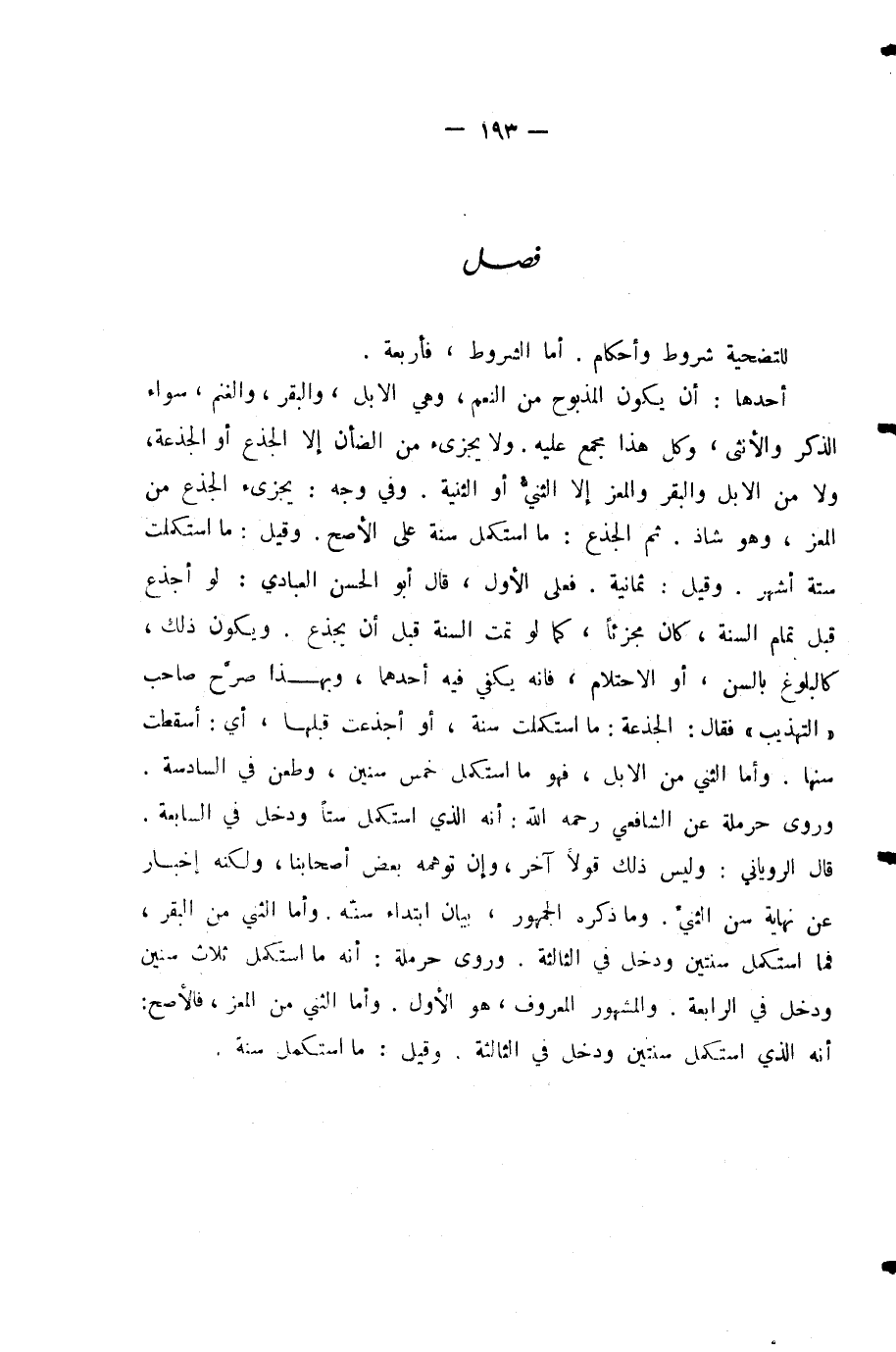 أَحَدُهَا: أَنْ يَكُونَ الْمَذْبُوحُ مِنَ النَّعَمِ، وَهِيَ الْإِبِلُ، وَالْبَقَرُ، وَالْغَنَمُ، سَوَاءٌ الذَّكَرُ وَالْأُنْثَى، وَكُلُّ هَذَا مُجْمَعٌ عَلَيْهِ. وَلَا يُجْزِئُ مِنَ الضَّأْنِ إِلَّا الْجَذَعُ أَوِ الْجَذَعَةُ، وَلَا مِنَ الْإِبِلِ وَالْبَقَرِ وَالْمَعْزِ إِلَّا الثَّنِيِّ أَوِ الثَّنِيَّةِ. وَفِي وَجْهٍ: يُجْزِئُ الْجَذَعُ مِنَ الْمَعْزِ، وَهُوَ شَاذٌّ. ثُمَّ الْجَذَعُ: مَا اسْتَكْمَلَ سَنَةً عَلَى الْأَصَحِّ. وَقِيلَ: مَا اسْتَكْمَلَتْ سِتَّةَ أَشْهُرٍ. وَقِيلَ: ثَمَانِيَةً. فَعَلَى الْأَوَّلِ، قَالَ أَبُو الْحَسَنِ الْعَبَّادِيُّ: لَوْ أَجْذَعَ قَبْلَ تَمَامِ السَّنَةِ، كَانَ مُجْزِئًا، كَمَا لَوْ تَمَّتِ السَّنَةُ قَبْلَ أَنْ يَجْذَعَ. وَيَكُونُ ذَلِكَ، كَالْبُلُوغِ بِالسِّنِّ، أَوِ الِاحْتِلَامِ، فَإِنْهُ يَكْفِي فِيهِ أَحَدُهُمَا، وَبِهَذَا صَرَّحَ صَاحِبُ «التَّهْذِيبِ» فَقَالَ: الْجَذَعَةُ: مَا اسْتَكْمَلَتْ سَنَةً، أَوْ أَجَذَعَتْ قَبْلَهَا، أَيْ: أَسْقَطَتْ سِنَّهَا. وَأَمَّا الثَّنْيُّ مِنَ الْإِبِلِ، فَهُوَ مَا اسْتَكْمَلَ خَمْسَ سِنِينَ، وَطَعَنَ فِي السَّادِسَةِ. وَرَوَى حَرْمَلَةُ عَنِ الشَّافِعِيِّ رَحِمَهُ اللَّهُ: أَنَّهُ الَّذِي اسْتَكْمَلَ سِتًّا وَدَخَلَ فِي السَّابِعَةِ. قَالَ الرُّويَانِيُّ: وَلَيْسَ ذَلِكَ قَوْلًا آخَرَ، وَإِنْ تَوَهَّمَهُ بَعْضُ أَصْحَابِنَا، وَلَكِنَّهُ إِخْبَارٌ عَنْ نِهَايَةِ سِنِّ الثَّنْيِ. وَمَا ذَكَرَهُ الْجُمْهُورُ، بَيَانُ ابْتِدَاءِ سِنِّهِ. وَأَمَّا الثَّنْيُ مِنَ الْبَقَرِ، فَمَا اسْتَكْمَلَ سَنَتَيْنِ وَدَخَلَ فِي الثَّالِثَةِ. وَرَوَى حَرْمَلَةُ: أَنَّهُ مَا اسْتَكْمَلَ ثَلَاثَ سِنِينَ وَدَخَلَ فِي الرَّابِعَةِ. وَالْمَشْهُورُ الْمَعْرُوفُ، هُوَ الْأَوَّلُ. وَأَمَّا الثَّنْيُ مِنَ الْمَعْزِ، فَالْأَصَحُّ: أَنَّهُ الَّذِي اسْتَكْمَلَ سَنَتَيْنِ وَدَخَلَ فِي الثَّالِثَةِ. وَقِيلَ: مَا اسْتَكْمَلَ سَنَةً.