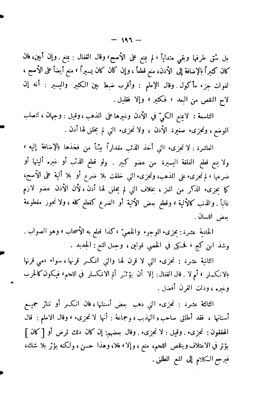 الْعَاشِرَةُ: لَا تُجْزِئُ الَّتِي أَخَذَ الذِّئْبُ مِقْدَارًا بَيِّنًا مِنْ فَخْذِهَا بِالْإِضَافَةِ إِلَيْهِ، وَلَا يَمْنَعُ قَطْعُ الْفَلْقَةِ الْيَسِيرَةِ مِنْ عُضْوٍ كَبِيرٍ وَلَوْ قَطَعَ الذِّئْبُ أَوْ غَيْرُهُ أَلْيَتَهَا أَوْ ضَرْعَهَا، لَمْ تُجْزِئْ عَلَى الْمَذْهَبِ، وَتُجْزِئُ الَّتِي خُلِقَتْ بِلَا ضَرْعٍ أَوْ بِلَا أَلْيَةٍ عَلَى الْأَصَحِّ، كَمَا يُجْزِئُ الذَّكَرُ مِنَ الْمَعْزِ، بِخِلَافِ الَّتِي لَمْ يُخْلَقْ لَهَا أُذُنٌ؛ لِأَنَّ الْأُذُنَ عُضْوٌ لَازِمٌ غَالِبًا. وَالذَّنَبُ كَالْأَلْيَةِ، وَقَطْعُ بَعْضِ الْأَلْيَةِ أَوِ الضَّرْعِ كَقَطْعِ كُلِّهِ، وَلَا تَجُوزُ مَقْطُوعَةُ بَعْضِ اللِّسَانِ.