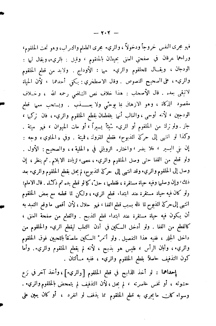 فَهُوَ مَجْرَى النَّفَسِ خُرُوجًا وَدُخُولًا، وَالْمَرِّيءُ مَجْرَى الطَّعَامِ وَالشَّرَابِ، وَهُوَ تَحْتَ الْحُلْقُومِ، وَرَاءَهُمَا عِرْقَانِ فِي صَفْحَتَيِ الْعُنُقِ يُحِيطَانِ بِالْحُلْقُومِ، وَقِيلَ: بِالْمَرِّيءِ، وَيُقَالُ لَهُمَا: الْوَدَجَانِ، وَيُقَالُ لِلْحُلْقُومِ وَالْمَرِّيءِ مَعَهُمَا: الْأَوْدَاجُ. وَلَا بُدَّ مِنْ قَطْعِ الْحُلْقُومِ وَالْمَرِّيءِ، عَلَى الصَّحِيحِ الْمَنْصُوصِ. وَقَالَ الِاصْطَخْرِيُّ: يَكْفِي أَحَدُهُمَا؛ لِأَنَّ الْحَيَاةَ لَا تَبْقَى بَعْدَهُ. قَالَ الْأَصْحَابُ: هَذَا خِلَافُ نَصِّ الشَّافِعِيِّ رَحِمَهُ اللَّهُ، وَخِلَافُ مَقْصُودِ الذَّكَاةِ، وَهُوَ الْإِزْهَاقُ بِمَا يُوحِي وَلَا يُعَذِّبُ. وَيُسْتَحَبُّ مَعَهُمَا قَطْعُ الْوَدَجَيْنِ؛ لِأَنَّهُ أَوْحَى، وَالْغَالِبُ أَنَّهُمَا يَنْقَطِعَانِ بِقَطْعِ الْحُلْقُومِ وَالْمَرِّيءِ، فَإِنْ تَرَكَهُمَا، جَازَ. وَلَوْ تَرَكَ مِنَ الْحُلْقُومِ أَوِ الْمَرِّيءِ شَيْئًا يَسِيرًا، أَوْ مَاتَ الْحَيَوَانُ، فَهُوَ مَيْتَةٌ. وَكَذَا لَوِ انْتَهَى إِلَى حَرَكَةِ الْمَذْبُوحِ، فَقَطَعَ الْمَتْرُوكَ، فَمَيْتَهٌ. وَفِي «الْحَاوِي» وَجْهٌ: إِنْ بَقِيَ الْيَسِيرُ، فَلَا يَضُرُّ، وَاخْتَارَهُ الرُّويَانِيُّ فِي «الْحِلْيَةِ» ، وَالصَّحِيحُ: الْأَوَّلُ.