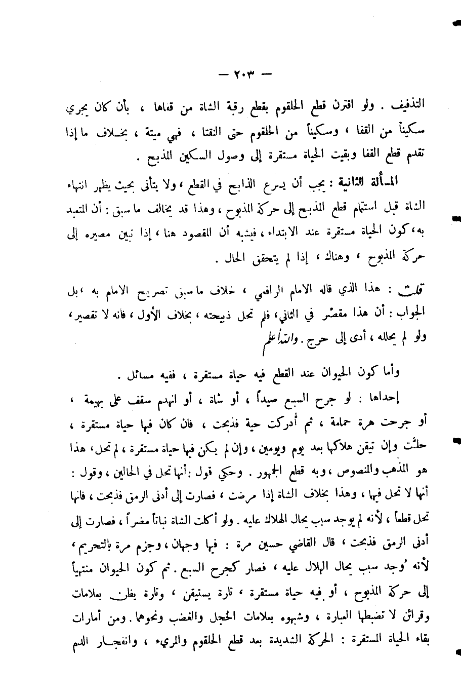 الْمَسْأَلَةُ الثَّانِيَةُ: يَجِبُ أَنْ يُسْرِعَ الذَّابِحُ فِي الْقَطْعِ، وَلَا يَتَأَنَّى بِحَيْثُ يَظْهَرُ انْتِهَاءُ الشَّاةِ قَبْلَ اسْتِتْمَامِ قَطْعِ الْمَذْبَحِ إِلَى حَرَكَةِ الْمَذْبُوحِ، وَهَذَا قَدْ يُخَالِفُ مَا سَبَقَ: أَنَّ الْمُتَعَبَّدَ بِهِ، كَوْنَ الْحَيَاةِ مُسْتَقِرَّةً عِنْدَ الِابْتِدَاءِ، فَيُشْبِهُ أَنَّ الْمَقْصُودَ هُنَا، إِذَا تَبَيَّنَ مَصِيرُهُ إِلَى حَرَكَةِ الْمَذْبُوحِ، وَهُنَاكَ، إِذَا لَمْ يَتَحَقَّقِ الْحَالُ.