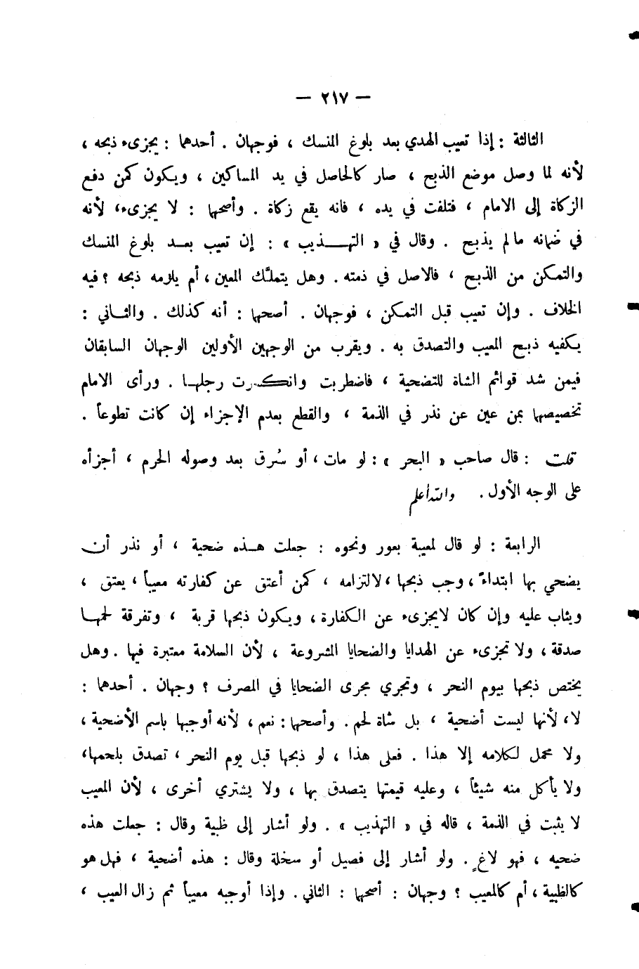 الثَّالِثَةُ: إِذَا تَعَيَّبَ الْهَدْيُ بَعْدَ بُلُوغِ الْمَنْسَكِ، فَوَجْهَانِ. أَحَدُهُمَا: يُجْزِئُ ذَبْحُهُ؛ لِأَنَّهُ لَمَّا وَصَلَ مَوْضِعَ الذَّبْحِ، صَارَ كَالْحَاصِلِ فِي يَدِ الْمَسَاكِينِ، وَيَكُونُ كَمَنْ دَفَعَ الزَّكَاةَ إِلَى الْإِمَامِ، فَتَلَفَتْ فِي يَدِهِ، فَإِنْهُ يَقَعُ زَكَاةً. وَأَصَحُّهُمَا: لَا يُجْزِئُ؛ لِأَنَّهُ فِي ضَمَانِهِ مَا لَمْ يُذْبَحْ. وَقَالَ فِي «التَّهْذِيبِ» : إِنْ تَعَيَّبَ بَعْدَ بُلُوغِ الْمَنْسَكِ وَالتَّمَكُّنِ مِنَ الذَّبْحِ، فَالْأَصْلُ فِي ذِمَّتِهِ وَهَلْ يَتَمَلَّكُ الْمُعَيَّنَ، أَمْ يَلْزَمُهُ ذَبْحُهُ؟ فِيهِ الْخِلَافُ. وَإِنْ تَعَيَّبَ قَبْلَ التَّمَكُّنِ، فَوَجْهَانِ. أَصَحُّهُمَا: أَنَّهُ كَذَلِكَ. وَالثَّانِي: يَكْفِيهِ ذَبْحُ الْمَعِيبِ وَالتَّصَدُّقُ بِهِ. وَيَقْرُبُ مِنَ الْوَجْهَيْنِ الْأَوَّلَيْنِ الْوَجْهَانِ السَّابِقَانِ فِيمَنْ شَدَّ قَوَائِمَ الشَّاةِ لِلتَّضْحِيَةِ، فَاضْطَرَبَتْ وَانْكَسَرَتْ رِجْلُهَا. وَرَأَى الْإِمَامُ تَخْصِيصَهُمَا بِمَنْ عَيَّنَ عَنْ نَذْرٍ فِي الذِّمَّةِ، وَالْقَطْعُ بِعَدَمِ الْإِجْزَاءِ إِنْ كَانَتْ تَطَوُّعًا.
