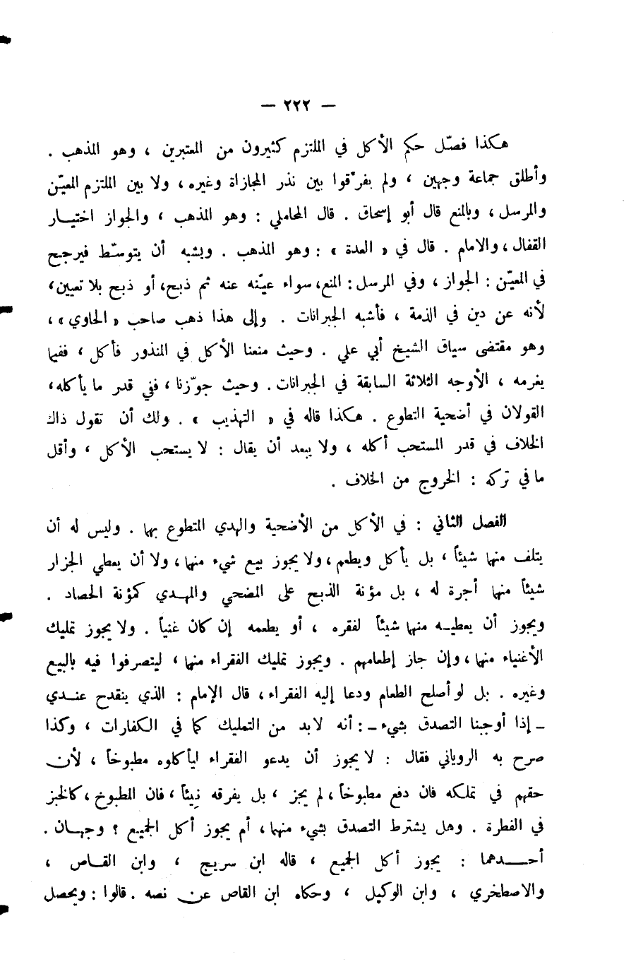 الْفَصْلُ الثَّانِي: فِي الْأَكْلِ مِنَ الْأُضْحِيَّةِ وَالْهَدْيِ الْمُتَطَوَّعِ بِهِمَا. وَلَيْسَ لَهُ أَنْ يُتْلِفَ مِنْهُمَا شَيْئًا، بَلْ يَأْكُلُ وَيُطْعِمُ، وَلَا يَجُوزُ بَيْعُ شَيْءٍ مِنْهُمَا، وَلَا أَنْ يُعْطِيَ الْجَزَّارَ شَيْئًا مِنْهُمَا أُجْرَةً لَهُ، بَلْ مُؤْنَةُ الذَّبْحِ عَلَى الْمُضَحِّي وَالْمَهْدِيِّ كَمُؤْنَةِ الْحَصَادِ. وَيَجُوزُ أَنْ يُعْطِيَهُ مِنْهُمَا شَيْئًا لِفَقْرِهِ، أَوْ يُطْعِمَهُ إِنْ كَانَ غَنِيًّا. وَلَا يَجُوزُ تَمْلِيكُ الْأَغْنِيَاءِ مِنْهُمَا، وَإِنْ جَازَ إِطْعَامُهُمْ. وَيَجُوزُ تَمْلِيكُ الْفُقَرَاءِ مِنْهُمَا، لِيَتَصَرَّفُوا فِيهِ بِالْبَيْعِ وَغَيْرِهِ. بَلْ لَوْ أَصْلَحَ الطَّعَامَ وَدَعَا إِلَيْهِ الْفُقَرَاءَ، قَالَ الْإِمَامُ: الَّذِي يَنْقَدِحُ عِنْدِي إِذَا أَوْجَبْنَا التَّصَدُّقَ بِشَيْءٍ: أَنَّهُ لَا بُدَّ مِنَ التَّمْلِيكِ كَمَا فِي الْكَفَّارَاتِ، وَكَذَا صَرَّحَ بِهِ الرُّويَانِيُّ فَقَالَ: لَا يَجُوزُ أَنْ يَدْعُوَ الْفُقَرَاءَ لِيَأْكُلُوهُ مَطْبُوخًا؛ لِأَنَّ حَقَّهُمْ فِي تَمَلُّكِهِ فَإِنْ دُفِعَ مَطْبُوخًا، لَمْ يَجُزْ، بَلْ يُفَرِّقُهُ نَيِّئًا، فَإِنَّ الْمَطْبُوخَ، كَالْخُبْزِ فِي الْفِطْرَةِ. وَهَلْ يَشْتَرِطُ التَّصَدُّقُ بِشَيْءٍ مِنْهُمَا، أَمْ يَجُوزُ أَكْلُ الْجَمِيعِ؟ وَجْهَانِ. أَحَدُهُمَا: يَجُوزُ أَكْلُ الْجَمِيعِ، قَالَهُ ابْنُ سُرَيْجٍ، وَابْنُ الْقَاصِّ، وَالِاصْطَخْرِيُّ، وَابْنُ الْوَكِيلِ، وَحَكَاهُ ابْنُ الْقَاصِّ عَنْ نَصِّهِ. قَالُوا: وَيَحْصُلُ