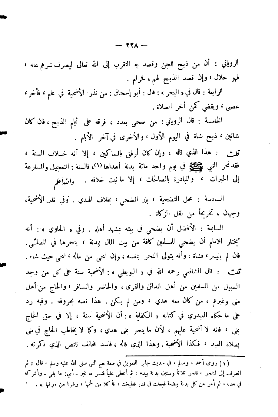 قُلْتُ: قَالَ الشَّافِعِيُّ رَحِمَهُ اللَّهُ فِي «الْبُوَيْطِيِّ» : الْأُضْحِيَّةُ سُنَّةٌ عَلَى كُلِّ مَنْ وَجَدَ السَّبِيلَ مِنَ الْمُسْلِمِينَ مِنْ أَهْلِ الْمَدَائِنِ وَالْقُرَى، وَالْحَاضِرِ وَالْمُسَافِرِ، وَالْحَاجِّ مِنْ أَهْلِ مِنَى وَغَيْرِهِمْ، مَنْ كَانَ مَعَهُ هَدْيٌ، وَمَنْ لَمْ يَكُنْ. هَذَا نَصُّهُ بِحُرُوفِهِ. وَفِيهِ رَدٌّ عَلَى مَا حَكَاهُ الْعَبْدَرِيُّ فِي كِتَابِهِ «الْكِفَايَةُ» : أَنَّ الْأُضْحِيَّةَ سُنَّةٌ، إِلَّا فِي حَقِّ الْحَاجِّ بِمِنَى، فَإِنَّهُ لَا أُضْحِيَّةَ عَلَيْهِمْ؛ لِأَنَّ مَا يُنْحَرُ بِمِنَى هَدْيٌ، وَكَمَا لَا يُخَاطَبُ الْحَاجُّ فِي مِنَى بِصَلَاةِ الْعِيدِ، فَكَذَا الْأُضْحِيَّةُ. وَهَذَا الَّذِي قَالَهُ فَاسِدٌ مُخَالِفٌ لِلنَّصِّ الَّذِي ذَكَرْتُهُ.