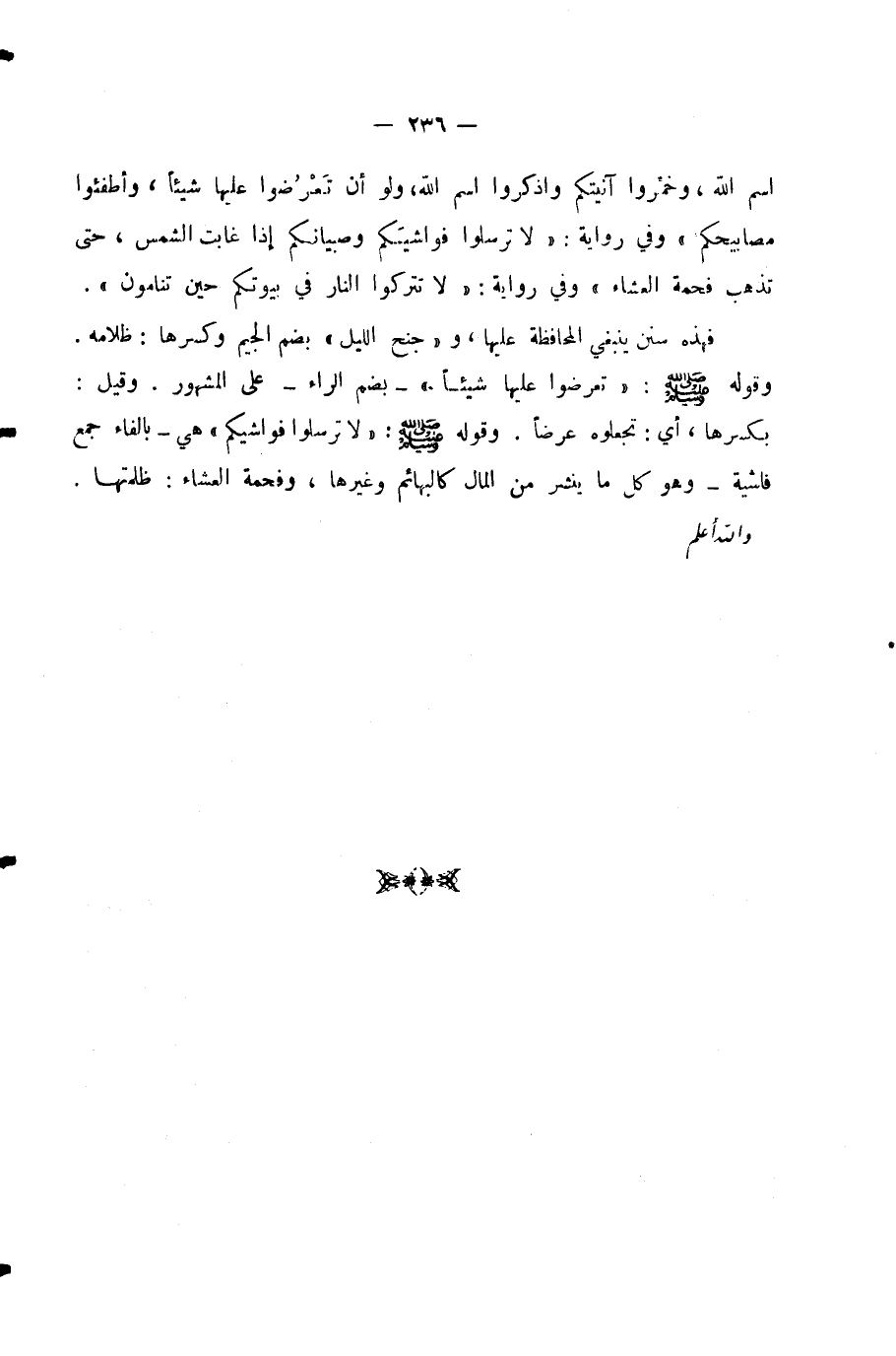 فَهَذِهِ سُنَنٌ يَنْبَغِي الْمُحَافَظَةُ عَلَيْهَا، وَجُنْحُ اللَّيْلِ بِضَمِّ الْجِيمِ وَكَسْرِهَا: ظَلَامُهُ. وَقَوْلُهُ صَلَّى اللَّهُ عَلَيْهِ وَسَلَّمَ: «تَعْرُضُوا عَلَيْهَا شَيْئًا» - بِضَمِّ الرَّاءِ - عَلَى الْمَشْهُورِ. وَقِيلَ: بِكَسْرِهَا، أَيْ: تَجْعَلُوهُ عَرْضًا. وَقَوْلُهُ صَلَّى اللَّهُ عَلَيْهِ وَسَلَّمَ: «لَا تُرْسِلُوا فَوَاشِيَكُمْ» هِيَ - بِالْفَاءِ جُمَعُ فَاشِيَةٍ - وَهُوَ كُلُّ مَا يُنْشَرُ مِنَ الْمَالِ كَالْبَهَائِمِ وَغَيْرِهَا، وَفُحْمَةُ الْعِشَاءِ: ظُلْمَتُهَا. وَاللَّهُ أَعْلَمُ.