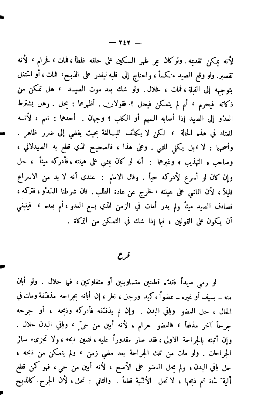 لَوْ رَمَى صَيْدًا فَقَدَّهُ قِطْعَتَيْنِ مُتَسَاوِيَتَيْنِ أَوْ مُتَفَاوِتَتَيْنِ، فَهُمَا حَلَالٌ. وَلَوْ أَبَانَ مِنْهُ - بِسَيْفٍ أَوْ غَيْرِهِ - عُضْوًا، كَيَدٍ وَرِجْلٍ، نُظِرَ، إِنْ أَبَانَهُ بِجِرَاحَةٍ مُذَفَّفَةٍ وَمَاتَ فِي الْحَالِ، حَلَّ الْعُضْوُ وَبَاقِي الْبَدَنِ. وَإِنْ لَمْ يُذَفِّفْهُ فَأَدْرَكَهُ وَذَبَحَهُ، أَوْ جَرَحَهُ جُرْحًا آخَرَ مُذَفَّفًا، فَالْعُضْوُ حَرَامٌ؛ لِأَنَّهُ أَبْيَنُ مِنْ حَيٍّ، وَبَاقِي الْبَدَنِ حَلَالٌ. وَإِنْ أَثْبَتَهُ بِالْجِرَاحَةِ الْأُولَى، فَقَدْ صَارَ مَقْدُورًا عَلَيْهِ، فَتَعَيَّنَ ذَبْحُهُ، وَلَا تُجْزِئُ سَائِرُ الْجِرَاحَاتِ. وَلَوْ مَاتَ مِنْ تِلْكَ الْجِرَاحَةِ بَعْدَ مُضِيِّ زَمَنٍ، وَلَمْ يَتَمَكَّنْ مِنْ ذَبْحِهِ، حَلَّ بَاقِي الْبَدَنِ، وَلَمْ يَحِلَّ الْعُضْوُ عَلَى الْأَصَحِّ لِأَنَّهُ أَبْيَنٌ مِنْ حَيٍّ، فَهُوَ كَمَنْ قَطَعَ أَلْيَةَ شَاةٍ ثُمَّ ذَبَحَهَا، لَا تَحِلُّ الْأَلْيَةُ قَطْعًا. وَالثَّانِي: تَحِلُّ؛ لِأَنَّ الْجَرْحَ كَالذَّبْحِ