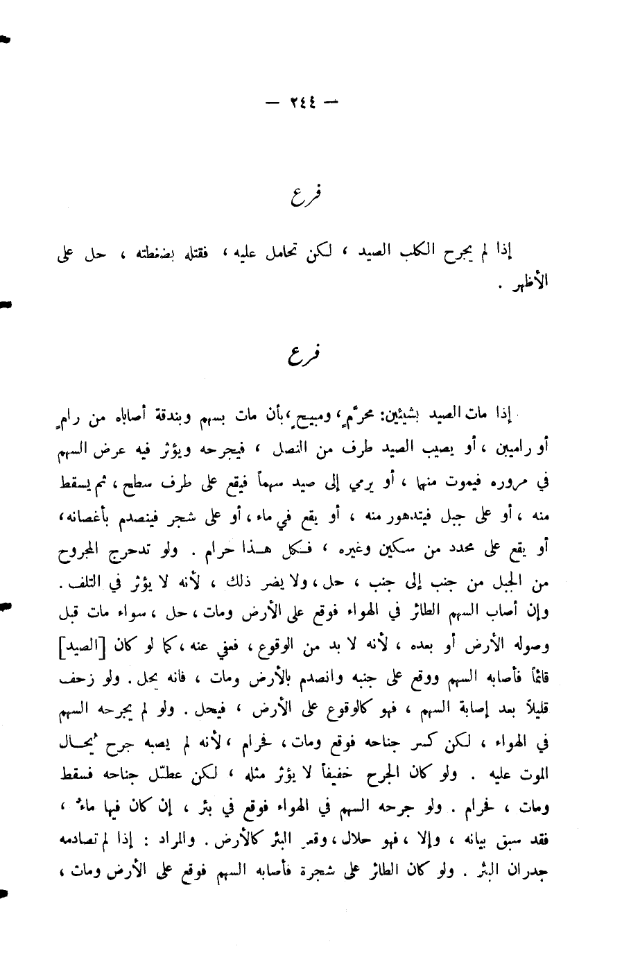وَلَوْ كَانَ الْجُرْحُ خَفِيفًا لَا يُؤَثِّرُ مِثْلُهُ، لَكِنْ عَطَّلَ جَنَاحَهُ فَسَقَطَ وَمَاتَ، فَحَرَامٌ. وَلَوْ جَرَحَهُ السَّهْمُ فِي الْهَوَاءِ فَوَقَعَ فِي بِئْرٍ، إِنْ كَانَ فِيهَا مَاءٌ، فَقَدْ سَبَقَ بَيَانُهُ، وَإِلَّا، فَهُوَ حَلَالٌ، وَقَعْرُ الْبِئْرِ كَالْأَرْضِ. وَالْمُرَادُ: إِذَا لَمْ تُصَادِمْهُ جُدْرَانُ الْبِئْرِ. وَلَوْ كَانَ الطَّائِرُ عَلَى شَجَرَةٍ فَأَصَابَهُ السَّهْمُ فَوَقَعَ عَلَى الْأَرْضِ وَمَاتَ،