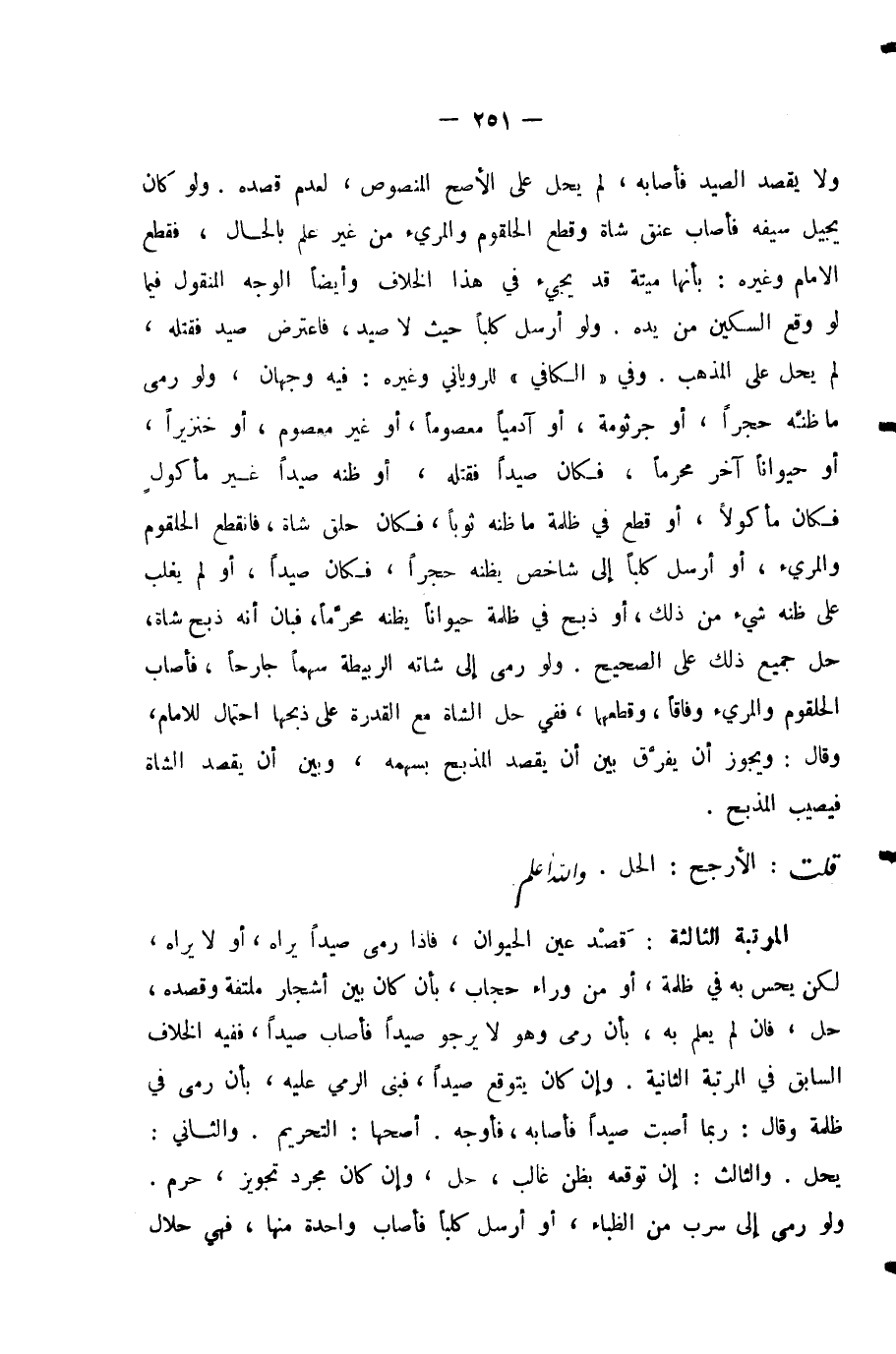الْمَرْتَبَةُ الثَّالِثَةُ: قَصْدُ عَيْنِ الْحَيَوَانِ، فَإِذَا رَمَى صَيْدًا يَرَاهُ، أَوْ لَا يَرَاهُ، لَكِنْ يَحِسُّ بِهِ فِي ظُلْمَةٍ، أَوْ مِنْ وَرَاءِ حِجَابٍ، بِأَنْ كَانَ بَيْنَ أَشْجَارٍ مُلْتَفَّةٍ وَقَصَدَهُ، حَلَّ، فَإِنْ لَمْ يَعْلَمْ بِهِ، بِأَنْ رَمَى وَهُوَ لَا يَرْجُو صَيْدًا فَأَصَابَ صَيْدًا، فَفِيهِ الْخِلَافُ السَّابِقُ فِي الْمَرْتَبَةِ الثَّانِيَةِ. وَإِنْ كَانَ يَتَوَقَّعُ صَيْدًا فَبَنَى الرَّمْيَ عَلَيْهِ، بِأَنْ رَمَى فِي ظُلْمَةِ اللَّيْلِ وَقَالَ: رُبَّمَا أَصَبْتُ صَيْدًا فَأَصَابَهُ؛ فَأَوْجُهٌ: أَصَحُّهَا: التَّحْرِيمُ. وَالثَّانِي: يَحِلُّ. وَالثَّالِثُ: إِنْ تَوَقَّعَهُ بِظَنٍّ غَالِبٍ، حَلَّ، وَإِنْ كَانَ مُجَرَّدَ تَجْوِيزٍ، حَرُمَ. وَلَوْ رَمَى إِلَى سِرْبٍ مِنَ الظِّبَاءِ، أَوْ أَرْسَلَ كَلْبًا فَأَصَابَ وَاحِدَةً مِنْهَا، فَهِيَ حَلَالٌ