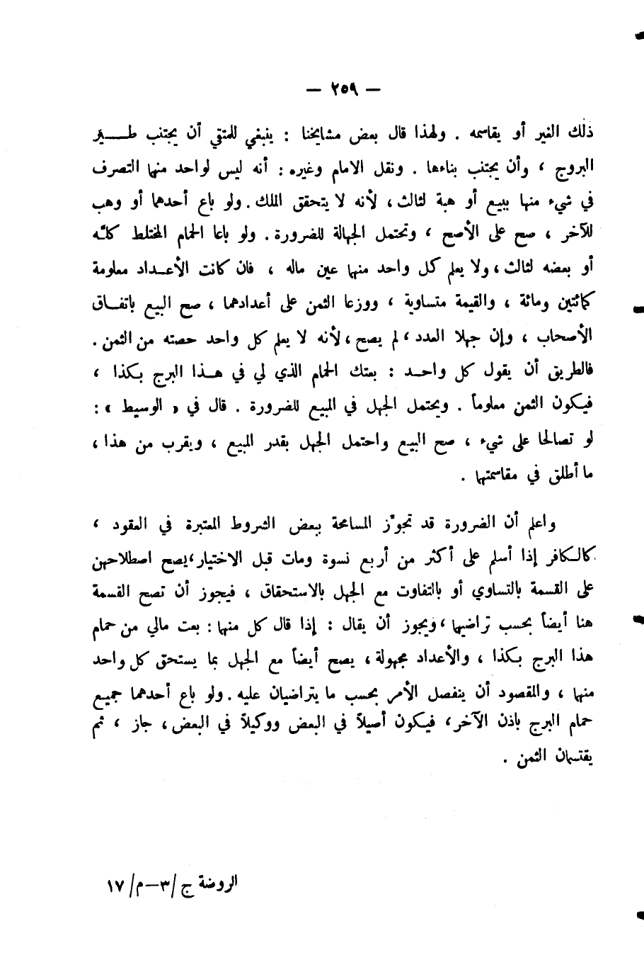وَاعْلَمْ أَنَّ الضَّرُورَةَ قَدْ تُجَوِّزُ الْمُسَامَحَةَ بِبَعْضِ الشُّرُوطِ الْمُعْتَبَرَةِ فِي الْعُقُودِ، كَالْكَافِرِ إِذَا أَسْلَمَ عَلَى أَكْثَرِ مِنْ أَرْبَعِ نِسْوَةٍ وَمَاتَ قَبْلَ الِاخْتِيَارِ، يَصِحُّ اصْطِلَاحُهُنَّ عَلَى الْقِسْمَةِ بِالتَّسَاوِي أَوْ بِالتَّفَاوُتِ مَعَ الْجَهْلِ بِالِاسْتِحْقَاقِ، فَيَجُوزُ أَنْ تَصِحَّ الْقِسْمَةُ هُنَا أَيْضًا بِحَسَبِ تَرَاضِيهِمَا، وَيَجُوزُ أَنْ يُقَالَ: إِذَا قَالَ كُلٌّ مِنْهُمَا: بِعْتُ مَا لِي مِنْ حَمَامِ هَذَا الْبُرْجِ بِكَذَا، وَالْأَعْدَادُ مَجْهُولَةٌ، يَصِحُّ أَيْضًا مَعَ الْجَهْلِ بِمَا يَسْتَحِقُّ كُلُّ وَاحِدٍ مِنْهُمَا، وَالْمَقْصُودُ أَنْ يَنْفَصِلَ الْأَمْرُ بِحَسَبِ مَا يَتَرَاضَيَانِ عَلَيْهِ وَلَوْ بَاعَ أَحَدُهُمَا جَمِيعَ حَمَامِ الْبُرْجِ بِإِذْنِ الْآخَرِ، فَيَكُونُ أَصِيلًا فِي الْبَعْضِ وَوَكِيلًا فِي الْبَعْضِ، جَازَ، ثُمَّ يَقْتَسِمَانِ الثَّمَنَ.