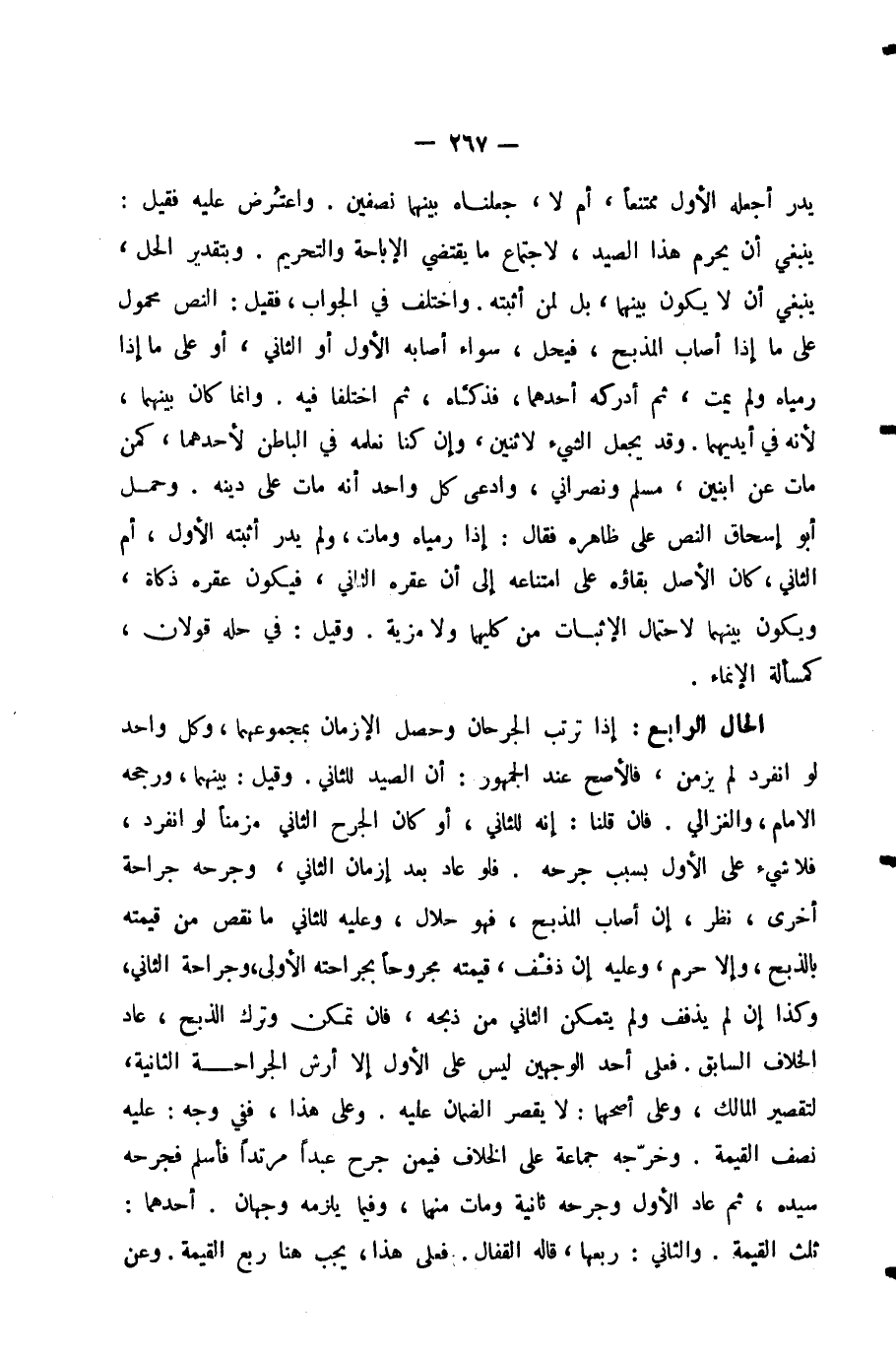 الْحَالُ الرَّابِعُ: إِذَا تَرَتَّبَ الْجُرْحَانِ وَحَصَلَ الْإِزْمَانُ بِمَجْمُوعِهِمَا، وَكُلُّ وَاحِدٍ لَوِ انْفَرَدَ لَمْ يُزْمِنْ، فَالْأَصَحُّ عِنْدَ الْجُمْهُورِ: أَنَّ الصَّيْدَ لِلثَّانِي. وَقِيلَ: بَيْنَهُمَا، وَرَجَّحَهُ الْإِمَامُ وَالْغَزَالِيُّ، فَإِنْ قُلْنَا: إِنْهُ لِلثَّانِي، أَوْ كَانَ الْجُرْحُ الثَّانِي مُزْمِنًا لَوِ انْفَرَدَ، فَلَا شَيْءَ عَلَى الْأَوَّلِ بِسَبَبِ جُرْحِهِ. فَلَوْ عَادَ بَعْدَ إِزْمَانِ الثَّانِي، وَجَرْحَهُ جِرَاحَةً أُخْرَى، نَظَرَ، إِنْ أَصَابَ الْمَذْبَحَ، فَهُوَ حَلَالٌ، وَعَلَيْهِ لِلثَّانِي مَا نَقَصَ مِنْ قِيمَتِهِ بِالذَّبْحِ، وَإِلَّا حُرِّمَ، وَعَلَيْهِ إِنْ ذَفَّفَ، قِيمَتُهُ مَجْرُوحًا بِجِرَاحَتِهِ الْأُولَى، وَجِرَاحَةِ الثَّانِي، وَكَذَا إِنْ لَمْ يُذَفِّفْ وَلَمْ يَتَمَكَّنِ الثَّانِي مِنْ ذَبْحِهِ، فَإِنْ تَمَكَّنَ وَتَرَكَ الذَّبْحَ، عَادَ الْخِلَافُ السَّابِقُ، فَعَلَى أَحَدِ الْوَجْهَيْنِ لَيْسَ عَلَى الْأَوَّلِ إِلَّا أَرْشُ الْجِرَاحَةِ الثَّانِيَةِ، لِتَقْصِيرِ الْمَالِكِ، وَعَلَى أَصَحِّهِمَا: لَا يُقْصَرُ الضَّمَانُ عَلَيْهِ. وَعَلَى هَذَا، فَفِي وَجْهٍ: عَلَيْهِ نِصْفُ الْقِيمَةِ. وَخَرَّجَهُ جَمَاعَةٌ عَلَى الْخِلَافِ فِيمَنْ جَرَحَ عَبْدًا مُرْتَدًّا فَأَسْلَمَ فَجَرَحَهُ سَيِّدُهُ، ثُمَّ عَادَ الْأَوَّلُ وَجَرَحَهُ ثَانِيَةً وَمَاتَ مِنْهُمَا وَفِيمَا يَلْزَمُهُ وَجْهَانِ. أَحَدُهُمَا: ثُلُثُ الْقِيمَةِ. وَالثَّانِي: رَبُعُهَا، قَالَهُ الْقَفَّالُ. فَعَلَى هَذَا، يَجِبُ هُنَا رُبْعُ الْقِيمَةِ. وَعَنْ