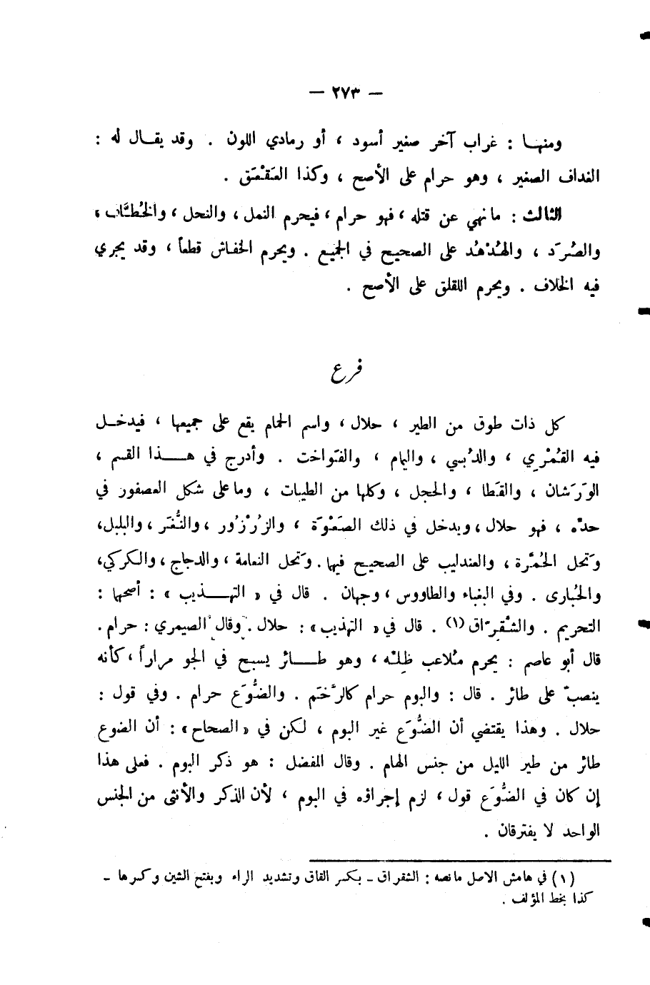 كُلُّ ذَاتِ طَوْقٍ مِنَ الطَّيْرِ حَلَالٌ، وَاسْمُ الْحَمَامِ يَقَعُ عَلَى جَمِيعِهَا، فَيُدْخُلُ فِيهِ الْقُمْرِيُّ وَالدُّبْسِيُّ وَالْيَمَامُ وَالْفَوَاخِتُ. وَأَدْرَجَ فِي هَذَا الْقِسْمِ، الْوَرَشَانَ وَالْقَطَا وَالْحَجَلَ وَكُلَّهَا مِنَ الطَّيِّبَاتِ. وَمَا عَلَى شَكْلِ الْعُصْفُورِ فِي حَدِّهِ فَهُوَ حَلَالٌ، وَيَدْخُلُ فِي ذَلِكَ الصَّعْوَةُ وَالزُّرْزُورُ وَالنُّغَرُ وَالْبُلْبُلُ وَتَحِلُّ الْحُمْرَةُ وَالْعَنْدَلِيبُ عَلَى الصَّحِيحِ فِيهِمَا. وَتَحِلُّ النَّعَامَةُ وَالدَّجَاجُ وَالْكُرْكِيُّ وَالْحُبَارَى. وُفِي الْبَغْبَغَاءِ وَالطَّاوُوسِ، وَجْهَانِ: قَالَ فِي «التَّهْذِيبِ» : أَصَحُّهُمَا: التَّحْرِيمُ. وَالشُّقْرَاقُ، قَالَ فِي «التَّهْذِيبِ» : حَلَالٌ. وَقَالَ الصَّيْمَرِيُّ: حَرَامٌ. قَالَ أَبُو عَاصِمٍ: يَحْرُمُ مُلَاعِبُ ظِلِّهِ، وَهُوَ طَائِرٌ يَسْبَحُ فِي الْجَوِّ مِرَارًا، كَأَنَّهُ يَنْصَبُّ عَلَى طَائِرٍ. قَالَ: وَالْبُومُ حَرَامٌ كَالرَّخْمِ. وَالضَّوْعُ حَرَامٌ، وَفِي قَوْلٍ: حَلَالٌ. وَهَذَا يَقْتَضِي أَنَّ الضَّوْعَ غَيْرُ الْبُومِ، لَكِنْ فِي «الصِّحَاحِ» : أَنَّ الضَّوْعَ طَائِرٌ مِنْ طَيْرِ اللَّيْلِ مَنْ جِنْسِ الْهَامِّ. وَقَالَ الْمُفَضَّلُ: هُوَ ذَكَرُ الْبُومِ. فَعَلَى هَذَا إِنْ كَانَ فِي الضَّوْعِ قَوْلٌ، لَزِمَ إِجْزَاؤُهُ فِي الْبُومِ؛ لِأَنَّ الذَّكَرَ وَالْأُنْثَى مِنَ الْجِنْسِ الْوَاحِدِ لَا يَفْتَرِقَانِ.