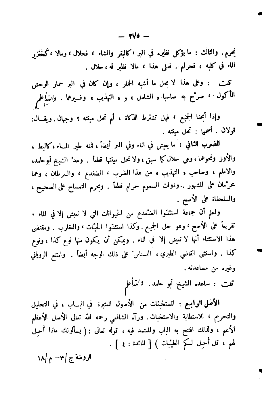 وَاعْلَمْ أَنَّ جَمَاعَةً اسْتَثْنَوُا الضُّفْدَعَ مِنَ الْحَيَوَانَاتِ الَّتِي لَا تَعِيشُ إِلَّا فِي الْمَاءِ، تَفْرِيعًا عَلَى الْأَصَحِّ، وَهُوَ حَلُّ الْجَمِيعِ. وَكَذَا اسْتَثْنَوُا الْحَيَّاتِ، وَالْعَقَارِبِ. وَمُقْتَضَى هَذَا الِاسْتِثْنَاءِ أَنَّهَا لَا تَعِيشُ إِلَّا فِي الْمَاءِ. وَيُمْكِنُ أَنْ يَكُونَ مِنْهَا نَوْعُ كَذَا، وَنَوْعُ كَذَا. وَاسْتَثْنَى الْقَاضِي الطَّبَرِيُّ، النِّسْنَاسَ عَلَى ذَلِكَ الْوَجْهِ أَيْضًا. وَامْتَنَعَ الرُّويَانِيُّ وَغَيْرُهُ مِنْ مُسَاعَدَتِهِ.
