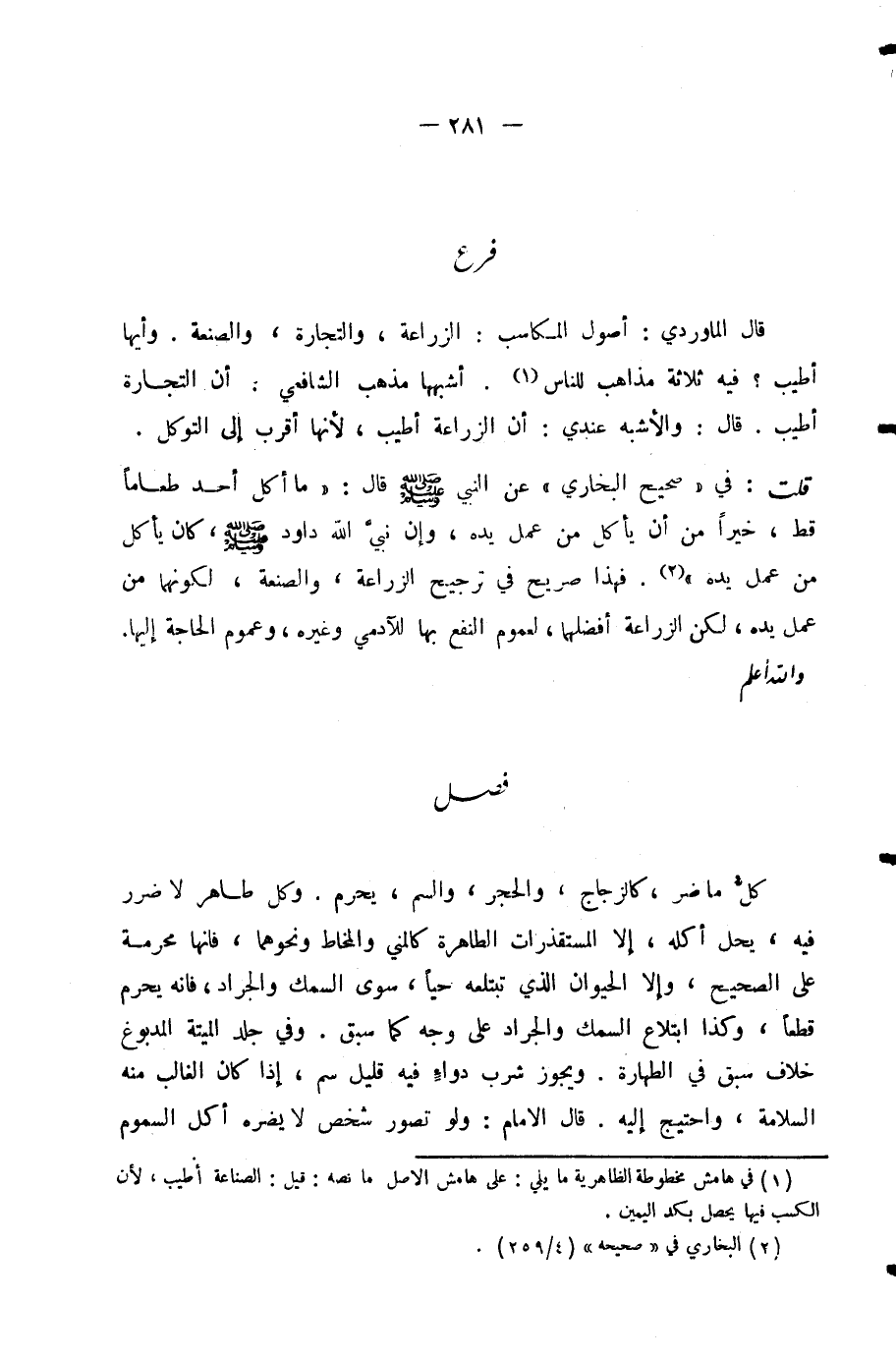 قُلْتُ: فِي «صَحِيحِ الْبُخَارِيِّ» عَنِ النَّبِيِّ صَلَّى اللَّهُ عَلَيْهِ وَسَلَّمَ قَالَ: «مَا أَكَلَ أَحَدٌ طَعَامًا قَطُّ خَيْرًا مِنْ أَنْ يَأْكُلَ مِنْ عَمَلِ يَدِهِ، وَإِنْ نَبِيَّ اللَّهِ دَاوُدَ صَلَّى اللَّهُ عَلَيْهِ وَسَلَّمَ، كَانَ يَأْكُلُ مِنْ عَمَلِ يَدِهِ» . فَهَذَا صَرِيحٌ فِي تَرْجِيحِ الزِّرَاعَةِ، وَالصَّنْعَةِ، لِكَوْنِهِمَا مِنْ عَمَلِ يَدِهِ، لَكِنَّ الزِّرَاعَةَ أَفْضَلُهُمَا؛ لِعُمُومِ النَّفْعِ بِهَا لِلْآدَمِيِّ وَغَيْرِهِ، وَعُمُومِ الْحَاجَةِ إِلَيْهَا. وَاللَّهُ أَعْلَمُ.