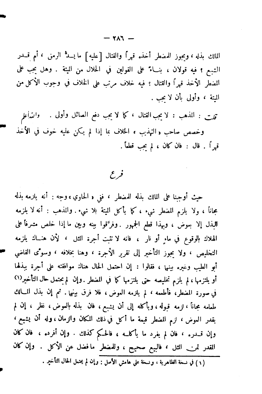 الْمَالِكِ بَذْلُهُ، وَيَجُوزُ لِلْمُضْطَرِّ أَخَذُهُ قَهْرًا وَالْقِتَالُ [عَلَيْهِ] مَا يَسُدُّ الرَّمَقَ، أَمْ قَدْرُ الشِّبَعِ؟ فِيهِ قَوْلَانِ بِنَاءً عَلَى الْقَوْلَيْنِ فِي الْحَلَالِ مِنَ الْمَيْتَةِ، وَهَلْ يَجِبُ عَلَى الْمُضْطَرِّ الْأَخْذُ قَهْرًا وَالْقِتَالُ؟ فِيهِ خِلَافٌ مُرَتَّبٌ عَلَى الْخِلَافِ فِي وُجُوبِ الْأَكْلِ مِنَ الْمَيْتَةِ، وَأَوْلَى بِأَنْ لَا يَجِبَ.