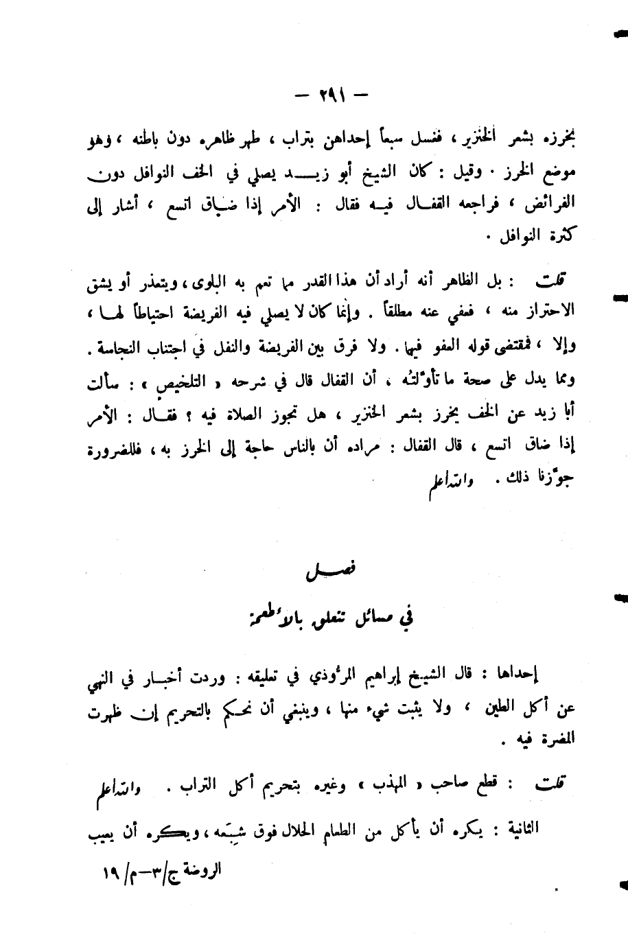 قُلْتُ: بَلِ الظَّاهِرُ أَنَّهُ أَرَادَ أَنَّ هَذَا الْقَدْرَ مِمَّا تَعُمُّ بِهِ الْبَلْوَى، وَيَتَعَذَّرُ أَوْ يَشُقُّ الِاحْتِرَازُ مِنْهُ، فَعُفِيَ عَنْهُ مُطْلَقًا. وَإِنَّمَا كَانَ لَا يُصَلِّي فِيهِ الْفَرِيضَةَ احْتِيَاطًا لَهَا، وَإِلَّا فَمُقْتَضَى قَوْلِهِ الْعَفْوُ فِيهِمَا. وَلَا فَرْقَ بَيْنَ الْفَرِيضَةِ وَالنَّفْلِ فِي اجْتِنَابِ النَّجَاسَةِ، وَمِمَّا يَدُلُّ عَلَى صِحَّةِ مَا تَأَوَّلْتُهُ، أَنَّ الْقَفَّالَ قَالَ فِي شَرْحِهِ «التَّلْخِيصِ» : سَأَلْتُ أَبَا زَيْدٍ عَنِ الْخُفِّ يُخَرَّزُ بِشَعْرِ الْخِنْزِيرِ، هَلْ تَجُوزُ الصَّلَاةُ فِيهِ؟ فَقَالَ: الْأَمْرُ إِذَا ضَاقَ اتَّسَعَ، قَالَ الْقَفَّالُ: مُرَادُهُ أَنَّ بِالنَّاسِ حَاجَةً إِلَى الْخَرْزِ بِهِ، فَلِلضَّرُورَةِ جَوَّزْنَا ذَلِكَ. وَاللَّهُ أَعْلَمُ.