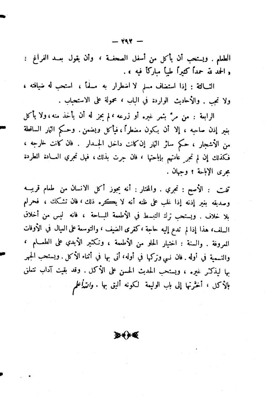 قُلْتُ: الْأَصَحُّ: تَجْرِي. وَالْمُخْتَارُ: أَنَّهُ يَجُوزُ أَكْلُ الْإِنْسَانِ مِنْ طَعَامِ قَرِيبِهِ وَصَدِيقِهِ بِغَيْرِ إِذْنِهِ إِذَا غَلَبَ عَلَى ظَنِّهِ أَنَّهُ لَا يَكْرَهُ ذَلِكَ، فَإِنْ تَشَكَّكَ، فَحَرَامٌ بِلَا خِلَافٍ. وَيُسْتَحَبُّ تَرْكُ التَّبَسُّطِ فِي الْأَطْعِمَةِ الْمُبَاحَةِ، فَإِنَّهُ لَيْسَ مِنْ أَخْلَاقِ السَّلَفِ، هَذَا إِذَا لَمْ تَدْعُ إِلَيْهِ حَاجَةٌ، كَقِرَى الضَّيْفِ، وَالتَّوْسِعَةِ عَلَى الْعِيَالِ فِي الْأَوْقَاتِ الْمَعْرُوفَةِ. وَالسُّنَّةُ: اخْتِيَارُ الْحُلْوِ مِنَ الْأَطْعِمَةِ، وَتَكْثِيرُ الْأَيْدِي عَلَى الطَّعَامِ، وَالتَّسْمِيَةُ فِي أَوَّلِهِ. فَإِنْ نَسِيَ وَتَرَكَهَا فِي أَوَّلِهِ، أَتَى بِهَا فِي أَثْنَاءِ الْأَكْلِ. وَيُسْتَحَبُّ الْجَهْرُ بِهَا لِيُذَكِّرَ غَيْرَهُ، وَيُسْتَحَبُّ الْحَدِيثُ الْحَسَنُ عَلَى الْأَكْلِ، وَقَدْ بَقِيَتْ آدَابٌ تَتَعَلَّقُ بِالْأَكْلِ، أَخَّرْتُهَا إِلَى بَابِ الْوَلِيمَةِ لِكَوْنِهِ أَلْيَقَ بِهَا. وَاللَّهُ أَعْلَمُ.