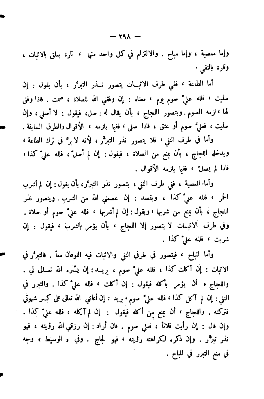 وَإِمَّا مَعْصِيَةٌ، وَإِمَّا مُبَاحٌ. وَالِالْتِزَامُ فِي كُلِّ وَاحِدٍ مِنْهُمَا، تَارَةً يُعَلَّقُ بِالْإِثْبَاتِ، وَتَارَةً بِالنَّفْيِ.