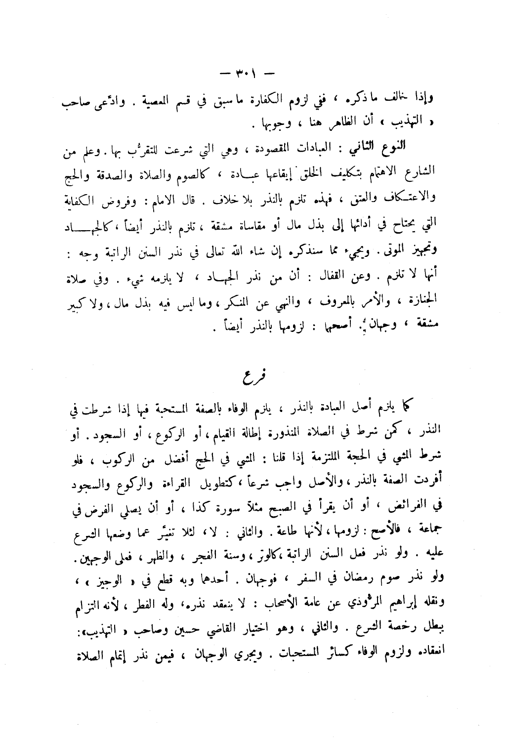 النَّوْعُ الثَّانِي: الْعِبَادَاتُ الْمَقْصُودَةُ، وَهِيَ الَّتِي شُرِعَتْ لِلتَّقَرُّبِ بِهَا. وَعُلِمَ مِنَ الشَّارِعِ الِاهْتِمَامُ بِتَكْلِيفِ الْخَلْقِ إِيقَاعَهَا عِبَادَةً، كَالصَّوْمِ وَالصَّلَاةِ وَالصَّدَقَةِ وَالْحَجِّ وَالِاعْتِكَافِ وَالْعِتْقِ، فَهَذِهِ تَلْزَمُ بِالنَّذْرِ بِلَا خِلَافٍ. قَالَ الْإِمَامُ: وَفُرُوضُ الْكِفَايَةِ الَّتِي يُحْتَاجُ فِي أَدَائِهَا إِلَى بَذْلِ مَالٍ أَوْ مُقَاسَاةِ مَشَقَّةٍ، تَلْزَمُ بِالنَّذْرِ أَيْضًا، كَالْجِهَادِ وَتَجْهِيزِ الْمَوْتَى. وَيَجِيءُ مِمَّا سَنَذْكُرُهُ إِنْ شَاءَ اللَّهُ تَعَالَى فِي نَذْرِ السُّنَنِ الرَّاتِبَةِ وَجْهُ: أَنَّهَا لَا تَلْزَمُ. وَعَنِ الْقَفَّالِ: أَنَّ مَنْ نَذَرَ الْجِهَادَ، لَا يَلْزَمُهُ شَيْءٌ. وَفِي صَلَاةِ الْجِنَازَةِ وَالْأَمْرِ بِالْمَعْرُوفِ، وَالنَّهْيِ عَنِ الْمُنْكَرِ، وَمَا لَيْسَ فِيهِ بَذْلُ مَالٍ، وَلَا كَبِيرُ مَشَقَّةٍ وَجْهَانِ. أَصَحُّهُمَا: لُزُومُهَا بِالنَّذْرِ أَيْضًا.