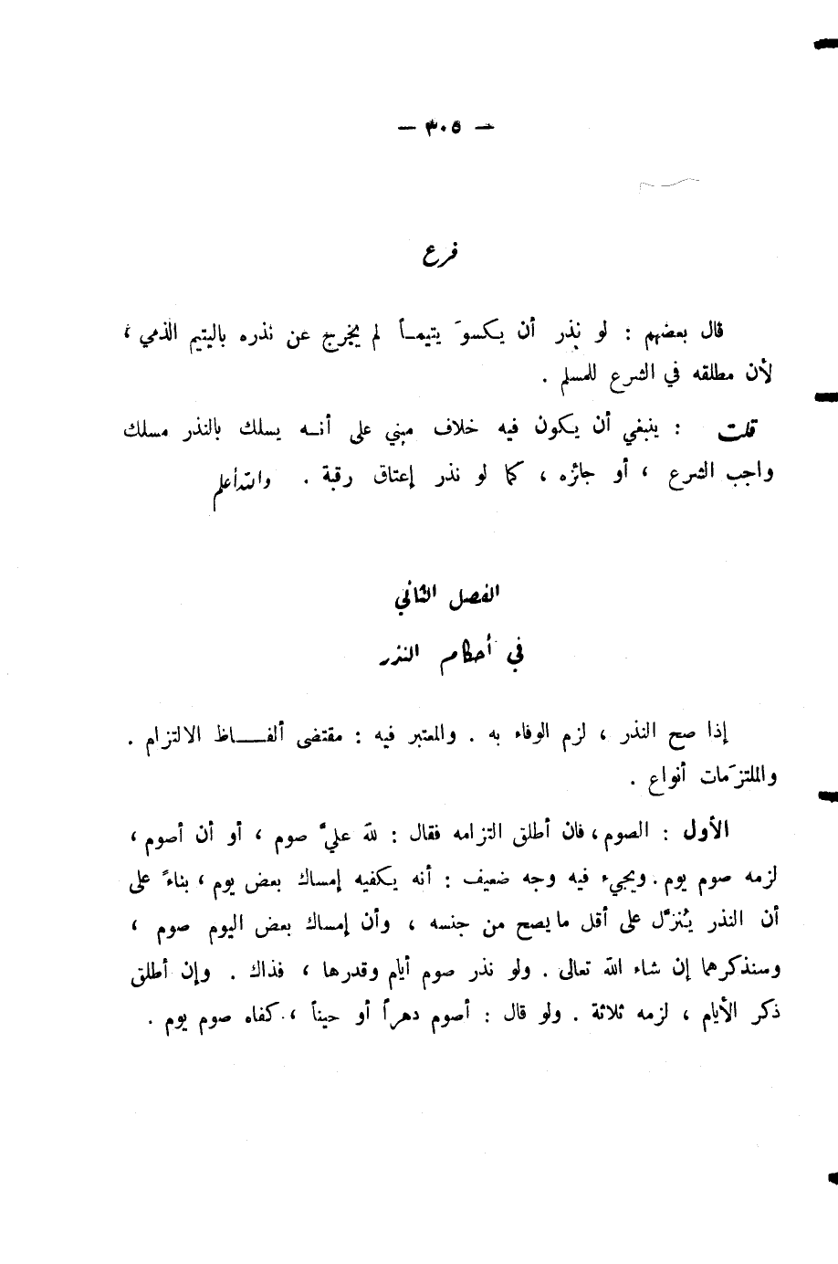 الْأَوَّلُ: الصَّوْمُ، فَإِنْ أَطْلَقَ الْتَزَامَهُ، فَقَالَ: لِلَّهِ عَلَيَّ صَوْمٌ، أَوْ أَنْ أَصُومَ، لَزِمَهُ صَوْمُ يَوْمٍ. وَيَجِيءُ فِيهِ وَجْهٌ ضَعِيفٌ: أَنَّهُ يَكْفِيهِ إِمْسَاكُ بَعْضِ يَوْمٍ، بِنَاءً عَلَى أَنَّ النَّذْرَ يُنَزَّلُ عَلَى أَقَلِّ مَا يَصِحُّ مِنْ جِنْسِهِ، وَأَنَّ إِمْسَاكَ بَعْضِ الْيَوْمِ صَوْمٌ، وَسَنَذْكُرُهُمَا إِنْ شَاءَ اللَّهُ تَعَالَى. وَلَوْ نَذَرَ صَوْمَ أَيَّامٍ وَقَدَّرَهَا، فَذَاكَ. وَإِنْ أَطْلَقَ ذِكْرَ الْأَيَّامِ، لَزِمَهُ ثَلَاثَةٌ. وَلَوْ قَالَ: أَصُومُ دَهْرًا أَوْ حِينًا، كَفَاهُ صَوْمُ يَوْمٍ.