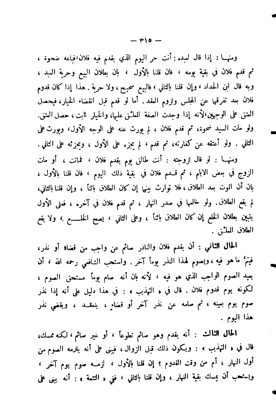 وَمِنْهَا: إِذَا قَالَ لِعَبْدِهِ: أَنْتَ حُرٌّ الْيَوْمَ الَّذِي يَقْدِمُ فِيهِ فُلَانٌ، فَبَاعَهُ ضَحْوَةً، ثُمَّ قَدِمَ فُلَانٌ فِي بَقِيَّةِ يَوْمِهِ، فَإِنْ قُلْنَا بِالْأَوَّلِ، بَانَ بُطْلَانُ الْبَيْعِ وَحُرِّيَّةُ الْعَبْدِ، وَبِهِ قَالَ ابْنُ الْحَدَّادِ، وَإِنْ قُلْنَا بِالثَّانِي، فَالْبَيْعُ صَحِيحٌ، وَلَا حُرِّيَّةَ. هَذَا إِذَا كَانَ قُدُومُ فُلَانٍ بَعْدَ تَفَرُّقِهِمَا عَنِ الْمَجْلِسِ وَلُزُومِ الْعَقْدِ. أَمَّا لَوْ قَدِمَ قَبْلَ انْقِضَاءِ الْخِيَارِ، فَيَحْصُلُ الْعِتْقُ عَلَى الْوَجْهَيْنِ؛ لِأَنَّهُ إِذَا وُجِدَتِ الصِّفَةُ الْمُعَلَّقُ عَلَيْهَا، وَالْخِيَارُ ثَابِتٌ، حَصَلَ الْعِتْقُ. وَلَوْ مَاتَ السَّيِّدُ ضَحْوَةً، ثُمَّ قَدِمَ فُلَانٌ، لَمْ يُوَرَّثْ عَنْهُ عَلَى الْوَجْهِ الْأَوَّلِ، وَيُوَرَّثُ عَلَى الثَّانِي. وَلَوْ أَعْتَقَهُ عَنْ كَفَّارَتِهِ، ثُمَّ قَدِمَ، لَمْ يُجْزِئْهُ عَلَى الْأَوَّلِ، وَيُجْزِئُهُ عَلَى الثَّانِي.