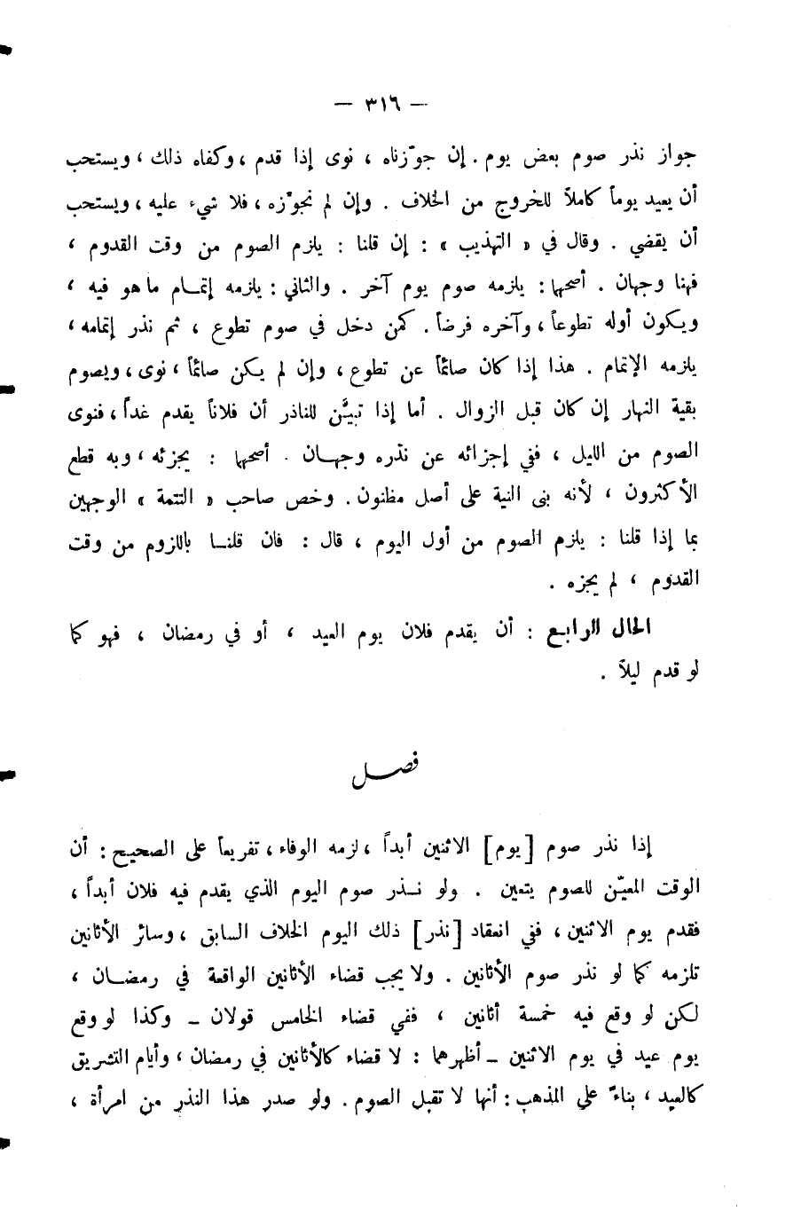جَوَازِ نَذْرِ صَوْمِ بَعْضِ يَوْمٍ. إِنْ جَوَّزْنَاهُ، نَوَى إِذَا قَدِمَ، وَكَفَاهُ ذَلِكَ، وَيُسْتَحَبُّ أَنْ يُعِيدَ يَوْمًا كَامِلًا لِلْخُرُوجِ مِنَ الْخِلَافِ. وَإِنْ لَمْ نُجَوِّزْهُ، فَلَا شَيْءَ عَلَيْهِ، وَيُسْتَحَبُّ أَنْ يَقْضِيَ. وَقَالَ فِي «التَّهْذِيبِ» : إِنْ قُلْنَا: يَلْزَمُ الصَّوْمُ مِنْ وَقْتِ الْقُدُومِ، فَهُنَا وَجْهَانِ. أَصَحُّهُمَا: يَلْزَمُهُ صَوْمُ يَوْمٍ آخَرَ. وَالثَّانِي: يَلْزَمُهُ إِتْمَامُ مَا هُوَ فِيهِ، وَيَكُونُ أَوَّلُهُ تَطَوُّعًا، وَآخِرُهُ فَرْضًا. كَمَنْ دَخَلَ فِي صَوْمِ تَطَوُّعٍ، ثُمَّ نَذَرَ إِتْمَامَهُ، يَلْزَمُهُ الْإِتْمَامُ. هَذَا إِذَا كَانَ صَائِمًا عَنْ تَطَوُّعٍ، وَإِنْ لَمْ يَكُنْ صَائِمًا، نَوَى، وَيَصُومُ بَقِيَّةَ النَّهَارِ إِنْ كَانَ قَبْلَ الزَّوَالِ. أَمَّا إِذَا تَبَيَّنَ لِلنَّاذِرِ أَنَّ فُلَانًا يَقْدِمُ غَدًا، فَنَوَى الصَّوْمَ مِنَ اللَّيْلِ، فَفِي إِجْزَائِهِ عَنْ نَذْرِهِ وَجْهَانِ. أَصَحُّهُمَا: يُجْزِئُهُ، وَبِهِ قَطَعَ الْأَكْثَرُونَ؛ لِأَنَّهُ بَنَى النِّيَّةَ عَلَى أَصْلٍ مَظْنُونٍ. وَخَصَّ صَاحِبُ التَّتِمَّةِ الْوَجْهَيْنِ بِمَا إِذَا قُلْنَا: يَلْزَمُ الصَّوْمُ مِنْ أَوَّلِ الْيَوْمِ، قَالَ: فَإِنْ قُلْنَا بِاللُّزُومِ مِنْ وَقْتِ الْقُدُومِ، لَمْ يُجْزِهِ.