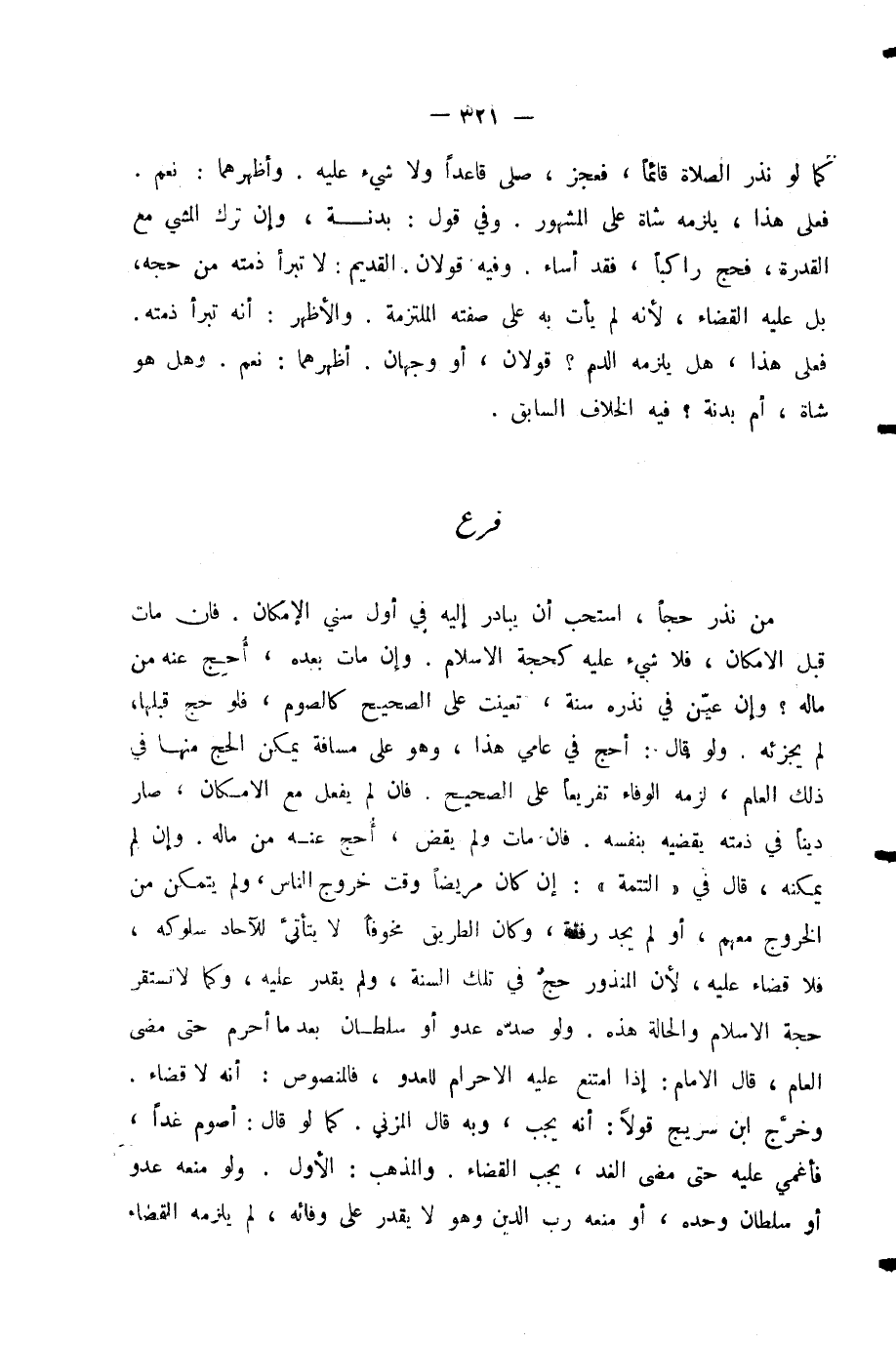 مَنْ نَذَرَ حَجًّا، اسْتُحِبَّ أَنْ يُبَادِرَ إِلَيْهِ فِي أَوَّلِ سِنِي الْإِمْكَانِ. فَإِنْ مَاتَ قَبْلَ الْإِمْكَانِ، فَلَا شَيْءَ عَلَيْهِ كَحَجَّةِ الْإِسْلَامِ. وَإِنْ مَاتَ بَعْدَهُ، أُحِجَّ عَنْهُ مِنْ مَالِهِ؟ وَإِنْ عَيَّنَ فِي نَذْرِهِ سَنَةً، تَعَيَّنَتْ عَلَى الصَّحِيحِ كَالصَّوْمِ، فَلَوْ حَجَّ قَبْلَهَا، لَمْ يُجْزِئْهُ. وَلَوْ قَالَ: أَحُجُّ فِي عَامِي هَذَا، وَهُوَ عَلَى مَسَافَةٍ يُمْكِنُ الْحَجُّ مِنْهَا فِي ذَلِكَ الْعَامِ، لَزِمَهُ الْوَفَاءُ تَفْرِيعًا عَلَى الصَّحِيحِ. فَإِنْ لَمْ يَفْعَلْ مَعَ الْإِمْكَانِ، صَارَ دَيْنًا فِي ذِمَّتِهِ يَقْضِيهِ بِنَفْسِهِ. فَإِنْ مَاتَ وَلَمْ يَقْضِ، أُحِجَّ عَنْهُ مِنْ مَالِهِ. وَإِنْ لَمْ يُمْكِنْهُ، قَالَ فِي «التَّتِمَّةِ» : إِنْ كَانَ مَرِيضًا وَقْتَ خُرُوجِ النَّاسِ، وَلَمْ يَتَمَكَّنْ مِنَ الْخُرُوجِ مَعَهُمْ، أَوْ لَمْ يَجِدْ رُفْقَةً، وَكَانَ الطَّرِيقُ مَخُوفًا لَا يَتَأَتَّى لِلْآحَادِ سُلُوكُهُ، فَلَا قَضَاءَ عَلَيْهِ؛ لِأَنَّ الْمَنْذُورَ حَجٌّ فِي تِلْكَ السَّنَةِ، وَلَمْ يَقْدِرْ عَلَيْهِ، وَكَمَا لَا تَسْتَقِرُّ حَجَّةُ الْإِسْلَامِ وَالْحَالَةُ هَذِهِ. وَلَوْ صَدَّهُ عَدُوٌّ أَوْ سُلْطَانٌ بَعْدَ مَا أَحْرَمَ حَتَّى مَضَى الْعَامُ، قَالَ الْإِمَامُ: إِذَا امْتَنَعَ عَلَيْهِ الْإِحْرَامُ لِلْعَدُوِّ، فَالْمَنْصُوصُ: أَنَّهُ لَا قَضَاءَ. وَخَرَّجَ ابْنُ سُرَيْجٍ قَوْلًا: أَنَّهُ يَجِبُ، وَبِهِ قَالَ الْمُزَنِيُّ. كَمَا لَوْ قَالَ: أَصُومُ غَدًا، فَأُغْمِيَ عَلَيْهِ حَتَّى مَضَى الْغَدُ، يَجِبُ الْقَضَاءُ. وَالْمَذْهَبُ: الْأَوَّلُ. وَلَوْ مَنَعَهُ عَدُوٌّ أَوْ سُلْطَانٌ وَحْدَهُ، أَوْ مَنَعَهُ رَبُّ الدَّيْنِ وَهُوَ لَا يَقْدِرُ عَلَى وَفَائِهِ، لَمْ يَلْزَمْهُ الْقَضَاءُ