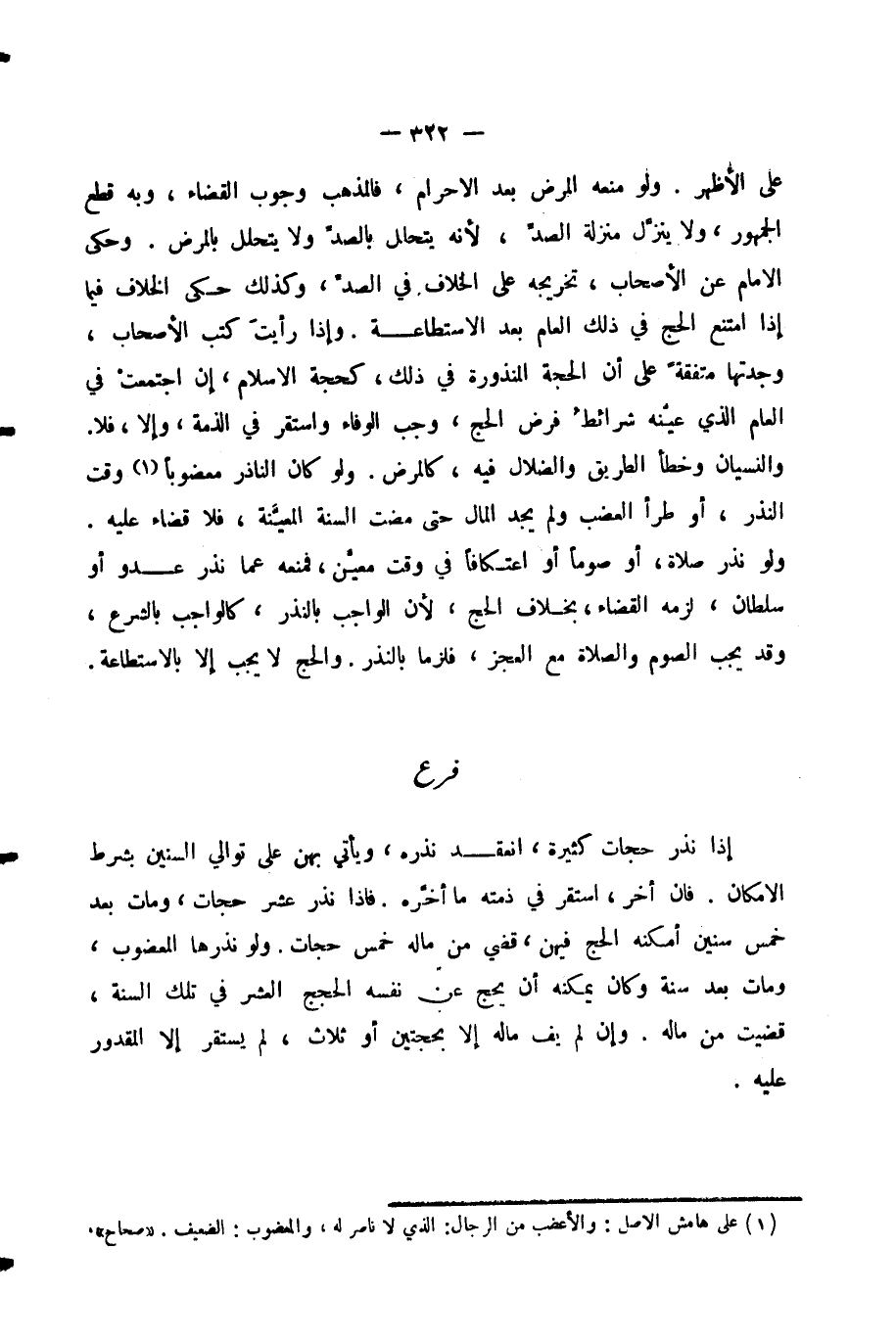 عَلَى الْأَظْهَرِ. وَلَوْ مَنَعَهُ الْمَرَضُ بَعْدَ الْإِحْرَامِ، فَالْمَذْهَبُ وُجُوبُ الْقَضَاءِ، وَبِهِ قَطَعَ الْجُمْهُورُ، وَلَا يُنَزَّلُ مَنْزِلَةَ الصَّدِّ؛ لِأَنَّهُ يَتَحَلَّلُ بِالصَّدِّ وَلَا يَتَحَلَّلُ بِالْمَرَضِ. وَحَكَى الْإِمَامُ عَنِ الْأَصْحَابِ، تَخْرِيجَهُ عَلَى الْخِلَافِ فِي الصَّدِّ، وَكَذَلِكَ حَكَى الْخِلَافَ فِيمَا إِذَا امْتَنَعَ الْحَجُّ فِي ذَلِكَ الْعَامِ بَعْدَ الِاسْتِطَاعَةِ. وَإِذَا رَأَيْتَ كُتُبَ الْأَصْحَابِ، وَجَدْتَهَا مُتَّفِقَةً عَلَى أَنَّ الْحَجَّةَ الْمَنْذُورَةَ فِي ذَلِكَ، كَحَجَّةِ الْإِسْلَامِ، إِنِ اجْتَمَعَتْ فِي الْعَامِ الَّذِي عَيَّنَهُ شَرَائِطُ فَرْضِ الْحَجِّ، وَجَبَ الْوَفَاءُ وَاسْتَقَرَّ فِي الذِّمَّةِ، وَإِلَّا، فَلَا. وَالنِّسْيَانُ وَخَطَأُ الطَّرِيقِ وَالضَّلَالُ فِيهِ، كَالْمَرَضِ. وَلَوْ كَانَ النَّاذِرُ مَعْضُوبًا وَقْتَ النَّذْرِ، أَوْ طَرَأَ الْعَضْبُ وَلَمْ يَجِدِ الْمَالَ حَتَّى مَضَتِ السَّنَةُ الْمُعَيَّنَةُ، فَلَا قَضَاءَ عَلَيْهِ.