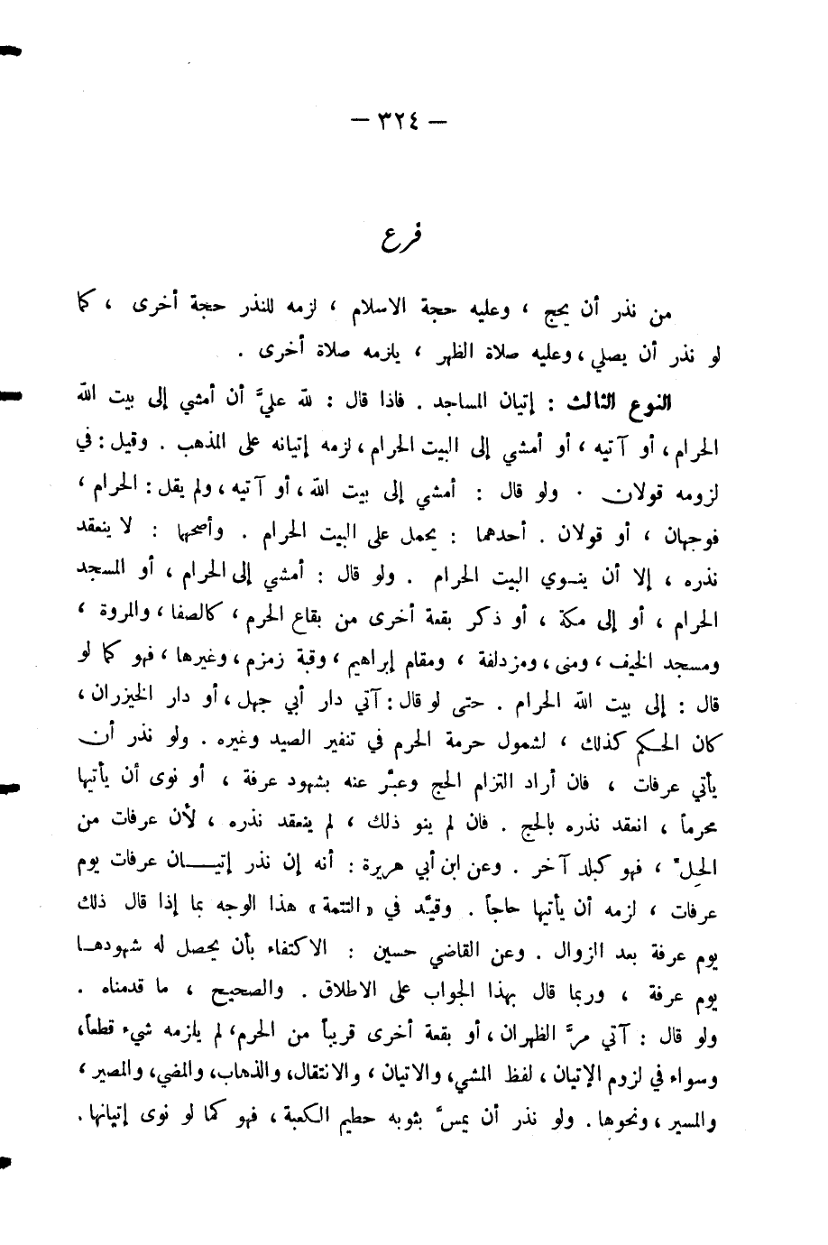 النَّوْعُ الثَّالِثُ: إِتْيَانُ الْمَسَاجِدِ. فَإِذَا قَالَ: لِلَّهِ عَلَيَّ أَنْ أَمْشِيَ إِلَى بَيْتِ اللَّهِ الْحَرَامِ، أَوْ آتِيهِ، أَوْ أَمْشِيَ إِلَى الْبَيْتِ الْحَرَامِ، لَزِمَهُ إِتْيَانُهُ عَلَى الْمَذْهَبِ. وَقِيلَ: فِي لُزُومِهِ قَوْلَانِ. وَلَوْ قَالَ: أَمْشِيَ إِلَى بَيْتِ اللَّهِ، أَوْ آتِيهِ، وَلَمْ يَقُلْ: الْحَرَامِ، فَوَجْهَانِ، أَوْ قَوْلَانِ.