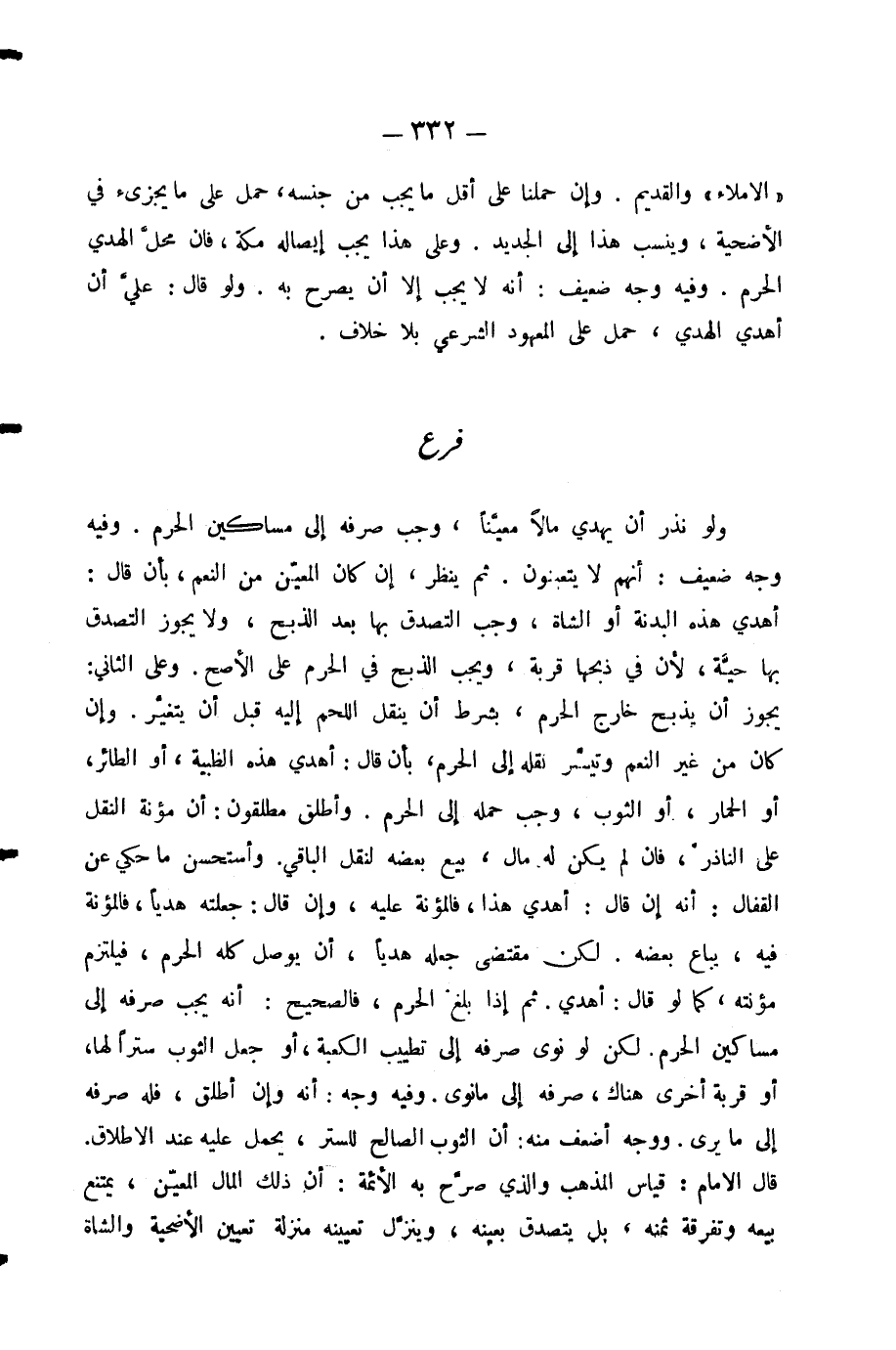 وَلَوْ نَذَرَ أَنْ يُهْدِيَ مَالًا مُعَيَّنًا، وَجَبَ صَرْفُهُ إِلَى مَسَاكِينِ الْحَرَمِ. وَفِيهِ وَجْهٌ ضَعِيفٌ: أَنَّهُمْ لَا يَتَعَيَّنُونَ. ثُمَّ يُنْظَرُ، إِنْ كَانَ الْمُعَيَّنُ مِنَ النِّعَمِ، بِأَنْ قَالَ: أُهْدِي هَذِهِ الْبَدَنَةَ أَوِ الشَّاةَ، وَجَبَ التَّصَدُّقُ بِهَا بَعْدَ الذَّبْحِ، وَلَا يَجُوزُ التَّصَدُّقُ بِهَا حَيَّةً؛ لِأَنَّ فِي ذَبْحِهَا قُرْبَةً، وَيَجِبُ الذَّبْحُ فِي الْحَرَمِ عَلَى الْأَصَحِّ. وَعَلَى الثَّانِي: يَجُوزُ أَنْ يَذْبَحَ خَارِجَ الْحَرَمِ، بِشَرْطِ أَنْ يَنْقُلَ اللَّحْمَ إِلَيْهِ قَبْلَ أَنْ يَتَغَيَّرَ. وَإِنْ كَانَ مِنْ غَيْرِ النِّعَمِ وَتَيَسَّرَ نَقْلُهُ إِلَى الْحَرَمِ، بِأَنْ قَالَ: أُهْدِي هَذِهِ الظَّبْيَةَ، أَوِ الطَّائِرَ، أَوِ الْحِمَارَ، أَوِ الثَّوْبَ، وَجَبَ حَمْلُهُ إِلَى الْحَرَمِ. وَأَطْلَقَ مُطْلِقُونَ: أَنَّ مُؤْنَةَ النَّقْلِ عَلَى النَّاذِرِ، فَإِنْ لَمْ يَكُنْ لَهُ مَالٌ، بِيعَ بَعْضُهُ لِنَقْلِ الْبَاقِي. وَأَسْتَحْسِنُ مَا حُكِيَ عَنِ الْقَفَّالِ: أَنَّهُ إِنْ قَالَ: أُهْدِي هَذَا، فَالْمُؤْنَةُ عَلَيْهِ، وَإِنْ قَالَ: جَعَلْتُهُ هَدْيًا، فَالْمُؤْنَةُ فِيهِ، يُبَاعُ بَعْضُهُ. لَكِنَّ مُقْتَضَى جَعْلِهِ هَدْيًا، أَنْ يُوصَلَ كُلُّهُ الْحَرَمَ، فَيَلْتَزِمُ مُؤْنَتَهُ، كَمَا لَوْ قَالَ: أُهْدِي. ثُمَّ إِذَا بَلَغَ الْحَرَمَ، فَالصَّحِيحُ: أَنَّهُ يَجِبُ صَرْفُهُ إِلَى مَسَاكِينِ الْحَرَمِ. لَكِنْ لَوْ نَوَى صَرْفَهُ إِلَى تَطْيِيبِ الْكَعْبَةِ، أَوْ جَعْلِ الثَّوْبِ سِتْرًا لَهَا، أَوْ قُرْبَةً أُخْرَى هُنَاكَ، صَرَفَهُ إِلَى مَا نَوَى. وَفِيهِ وَجْهٌ: أَنَّهُ وَإِنْ أَطْلَقَ، فَلَهُ صَرْفُهُ إِلَى مَا يَرَى. وَوَجْهٌ أَضْعَفُ مِنْهُ: أَنَّ الثَّوْبَ الصَّالِحَ لِلسَّتْرِ، يُحْمَلُ عَلَيْهِ عِنْدَ الْإِطْلَاقِ. قَالَ الْإِمَامُ: قِيَاسُ الْمَذْهَبِ وَالَّذِي صَرَّحَ بِهِ الْأَئِمَّةُ: أَنَّ ذَلِكَ الْمَالَ الْمُعَيَّنَ، يَمْتَنِعُ بَيْعُهُ وَتَفْرِقَةُ ثَمَنِهِ، بَلْ يَتَصَدَّقُ بِعَيْنِهِ، وَيُنَزَّلُ تَعْيِينُهُ مَنْزِلَةَ تَعْيِينِ الْأُضْحِيَةِ وَالشَّاةِ