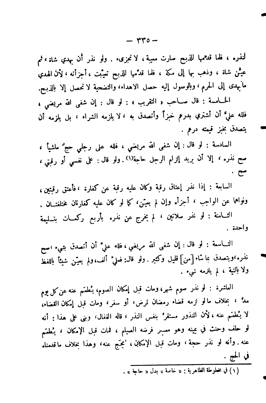 السَّادِسَةُ: لَوْ قَالَ: إِنْ شَفَى اللَّهُ مَرِيضِي، فَلِلَّهِ عَلَى رِجْلِي حَجٌّ مَاشِيًا، صَحَّ نَذْرُهُ، إِلَّا أَنْ يُرِيدَ إِلْزَامَ الرِّجْلِ حَاجَةً. وَلَوْ قَالَ: عَلَى نَفْسِي أَوْ رَقَبَتِي، صَحَّ.