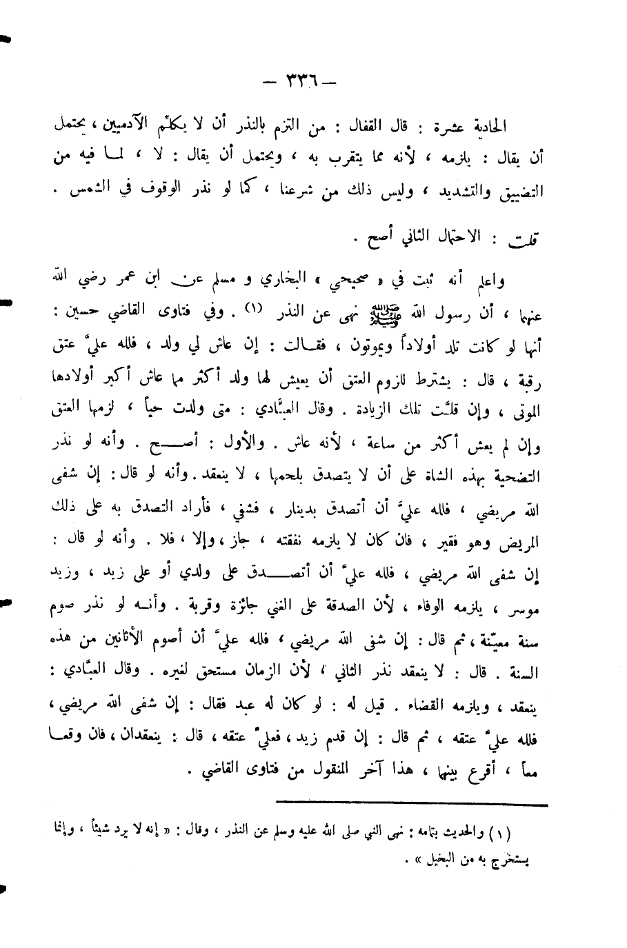 الْحَادِيَةَ عَشْرَةَ: قَالَ الْقَفَّالُ: مَنِ الْتَزَمَ بِالنَّذْرِ أَنْ لَا يُكَلِّمَ الْآدَمِيِّينَ، يُحْتَمَلُ أَنْ يُقَالَ: يَلْزَمُهُ؛ لِأَنَّهُ مِمَّا يُتَقَرَّبُ بِهِ، وَيُحْتَمَلُ أَنْ يُقَالَ: لَا، لِمَا فِيهِ مِنَ التَّضْيِيقِ وَالتَّشْدِيدِ، وَلَيْسَ ذَلِكَ مِنْ شَرْعِنَا، كَمَا لَوْ نَذَرَ الْوُقُوفَ فِي الشَّمْسِ.