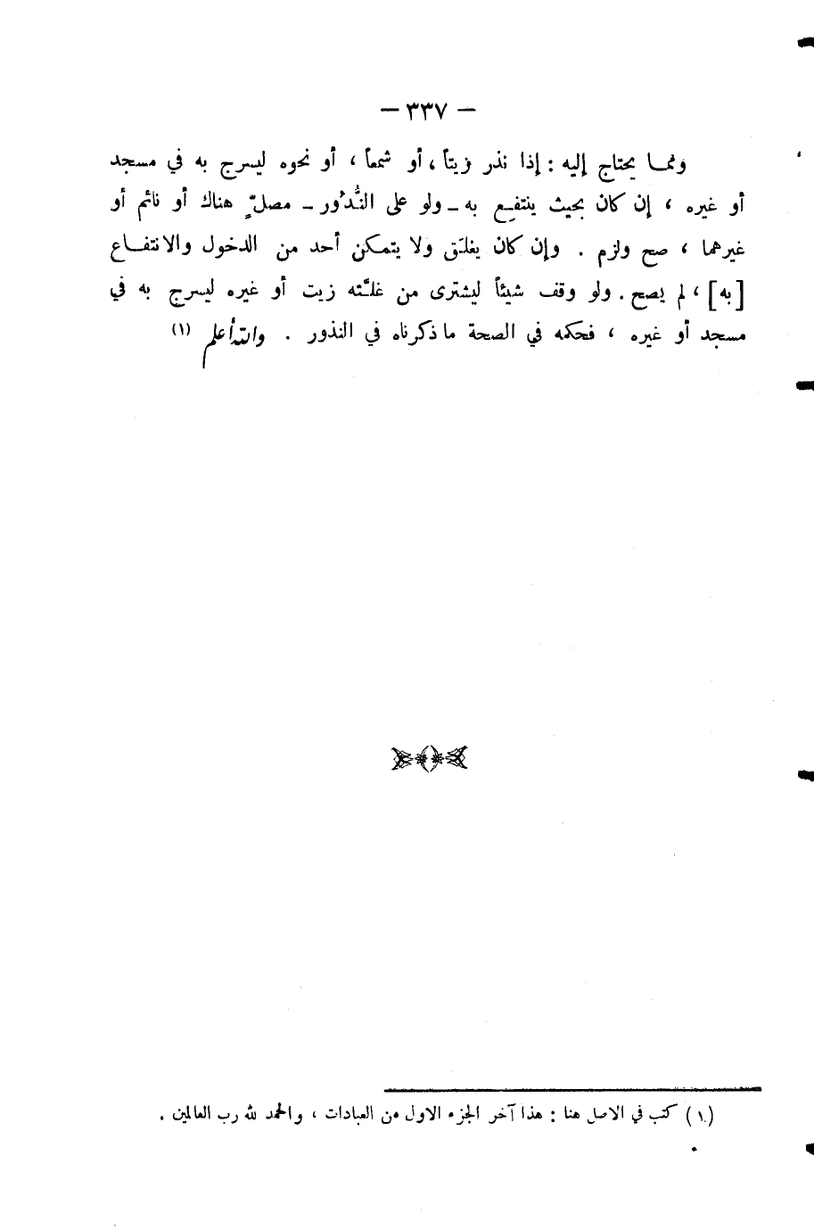 وَمِمَّا يُحْتَاجُ إِلَيْهِ: إِذَا نَذَرَ زَيْتًا، أَوْ شَمْعًا، أَوْ نَحْوَهُ لِيُسْرِجَ بِهِ فِي مَسْجِدٍ أَوْ غَيْرِهِ، إِنْ كَانَ بِحَيْثُ يَنْتَفِعُ بِهِ - وَلَوْ عَلَى النُّدُورِ - مُصَلٍّ هُنَاكَ أَوْ نَائِمٌ أَوْ غَيْرُهُمَا، صَحَّ وَلَزِمَ. وَإِنْ كَانَ يُغْلَقُ وَلَا يَتَمَكَّنُ أَحَدٌ مِنَ الدُّخُولِ وَالِانْتِفَاعِ بِهِ، لَمْ يَصِحَّ. وَلَوْ وَقَفَ شَيْئًا لِيُشْتَرَى مِنْ غَلَّتِهِ زَيْتٌ أَوْ غَيْرُهُ لِيُسْرِجَ بِهِ فِي مَسْجِدٍ أَوْ غَيْرِهِ، فَحُكْمُهُ فِي الصِّحَّةِ مَا ذَكَرْنَاهُ فِي النُّذُورِ. وَاللَّهُ أَعْلَمُ.
