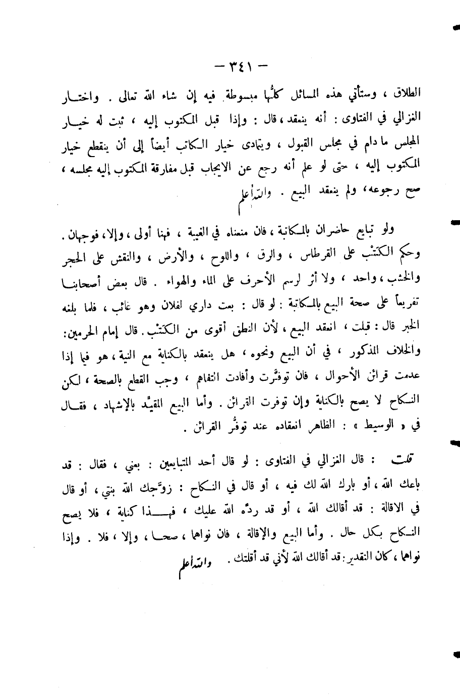 الطَّلَاقِ، وَسَتَأْتِي هَذِهِ الْمَسَائِلُ كُلُّهَا مَبْسُوطَةً فِيهِ إِنْ شَاءَ اللَّهُ تَعَالَى. وَاخْتَارَ الْغَزَالِيُّ فِي الْفَتَاوَى: أَنَّهُ يَنْعَقِدُ، قَالَ: وَإِذَا قَبِلَ الْمَكْتُوبُ إِلَيْهِ، ثَبَتَ لَهُ خِيَارُ الْمَجْلِسِ، مَا دَامَ فِي مَجْلِسِ الْقَبُولِ، وَيَتَمَادَى خِيَارُ الْكَاتِبِ أَيْضًا إِلَى أَنْ يَنْقَطِعَ خِيَارُ الْمَكْتُوبِ إِلَيْهِ، حَتَّى لَوْ عَلِمَ أَنَّهُ رَجَعَ عَنِ الْإِيجَابِ قَبْلَ مُفَارَقَةِ الْمَكْتُوبِ إِلَيْهِ مَجْلِسَهُ، صَحَّ رُجُوعُهُ، وَلَمْ يَنْعَقِدِ الْبَيْعُ. وَاللَّهُ أَعْلَمُ.