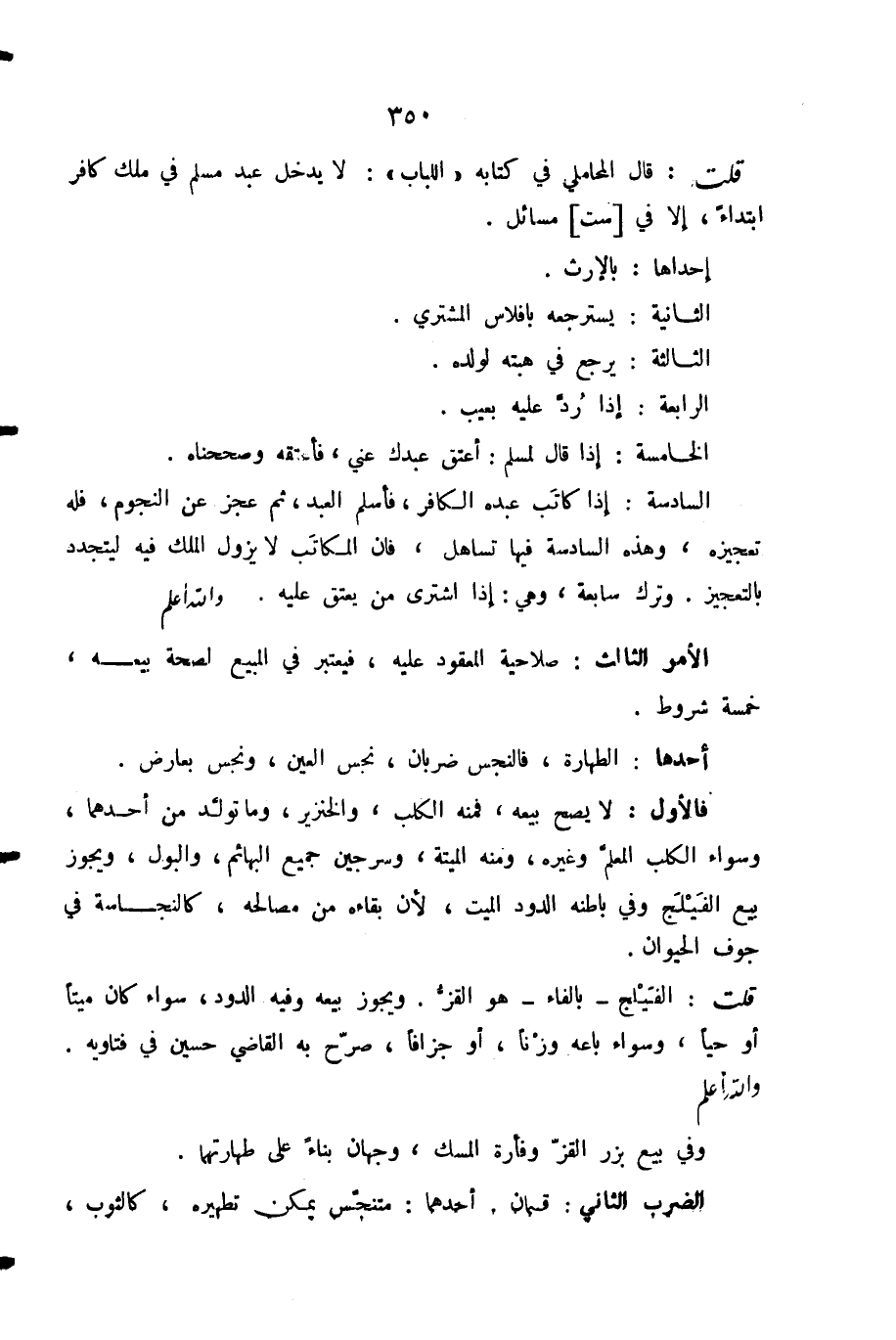 أَحَدُهَا: الطَّهَارَةُ، فَالنَّجَسُ ضَرْبَانِ، نَجَسُ الْعَيْنِ، وَنَجَسٌ بِعَارِضٍ. فَالْأَوَّلُ: لَا يَصِحُّ بَيْعُهُ، فَمِنْهُ الْكَلْبُ، وَالْخِنْزِيرُ، وَمَا تَوَلَّدَ مِنْ أَحَدِهِمَا، وَسَوَاءٌ الْكَلْبُ الْمُعَلَّمُ وَغَيْرُهُ، وَمِنْهُ الْمَيْتَةُ، وَسِرْجِينُ جَمِيعِ الْبَهَائِمِ، وَالْبَوْلُ، وَيَجُوزُ بَيْعُ الْفَيْلَجِ وَفِي بَاطِنِهِ الدُّودُ الْمَيِّتُ؛ لِأَنَّ بَقَاءَهُ مِنْ مَصَالِحِهِ، كَالنَّجَاسَةِ فِي جَوْفِ الْحَيَوَانِ.