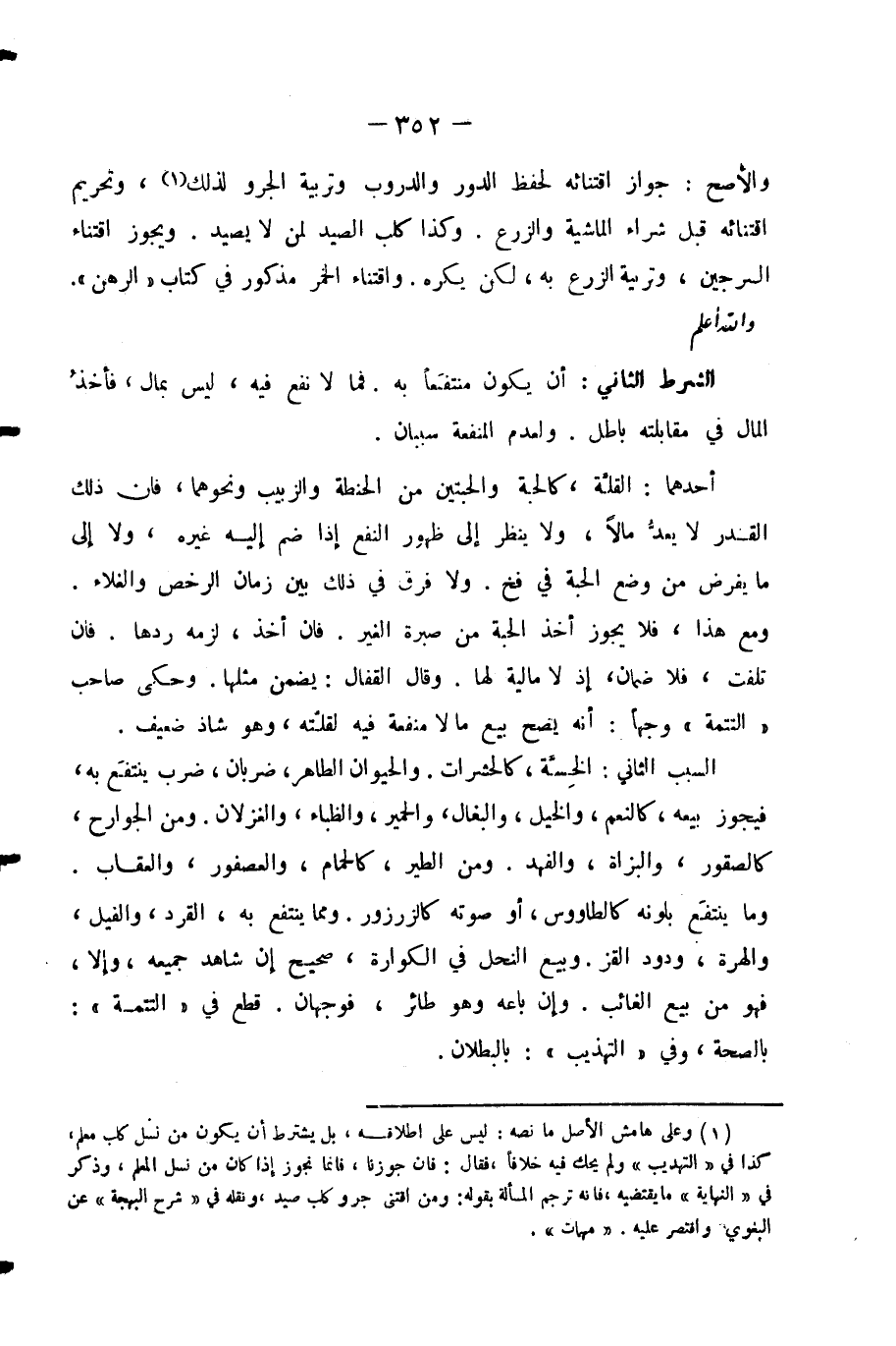 السَّبَبُ الثَّانِي: الْخِسَّةُ، كَالْحَشَرَاتِ. وَالْحَيَوَانُ الطَّاهِرُ، ضَرْبَانِ: ضَرْبٌ يُنْتَفَعُ بِهِ، فَيَجُوزُ بَيْعُهُ، كَالنَّعَمِ، وَالْخَيْلِ، وَالْبِغَالِ، وَالْحَمِيرِ، وَالظِّبَاءِ، وَالْغِزْلَانِ. وَمِنَ الْجَوَارِحِ، كَالصُّقُورِ، وَالْبُزَاةِ، وَالْفَهْدِ. وَمِنَ الطَّيْرِ، كَالْحَمَامِ، وَالْعُصْفُورِ، وَالْعُقَابِ. وَمَا يُنْتَفَعُ بِلَوْنِهِ كَالطَّاوُوسِ، أَوْ صَوْتِهِ كَالزُّرْزُورِ. وَمِمَّا يُنْتَفَعُ بِهِ، الْقِرْدُ، وَالْفِيلُ، وَالْهِرَّةُ، وَدُودُ الْقَزِّ. وَبَيْعُ النَّحْلِ فِي الْكِوَارَةِ صَحِيحٌ إِنْ شَاهَدَ جَمِيعَهُ، وَإِلَّا، فَهُوَ مِنْ بَيْعِ الْغَائِبِ. وَإِنْ بَاعَهُ وَهُوَ طَائِرٌ، فَوَجْهَانِ. قُطِعَ فِي «التَّتِمَّةِ» : بِالصِّحَّةِ، وَفِي «التَّهْذِيبِ» : بِالْبُطْلَانِ.