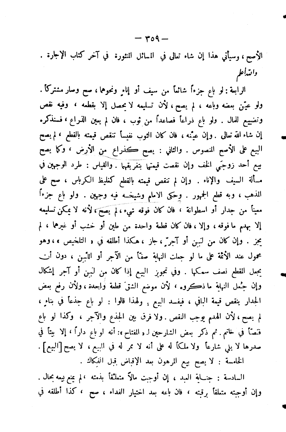 الرَّابِعَةُ: لَوْ بَاعَ جُزْءًا شَائِعًا مِنْ سَيْفٍ أَوْ إِنَاءٍ وَنَحْوِهِمَا، صَحَّ وَصَارَ مُشْتَرَكًا. وَلَوْ عَيَّنَ بَعْضَهُ وَبَاعَهُ، لَمْ يَصِحَّ؛ لِأَنَّ تَسْلِيمَهُ لَا يَحْصُلُ إِلَّا بِقَطْعِهِ، وَفِيهِ نَقْصٌ وَتَضْيِيعٌ لِلْمَالِ. وَلَوْ بَاعَ ذِرَاعًا فَصَاعِدًا مِنْ ثَوْبٍ، فَإِنْ لَمْ يُعَيِّنِ الذِّرَاعَ، فَسَنَذْكُرُهُ إِنْ شَاءَ اللَّهُ تَعَالَى. وَإِنْ عَيَّنَهُ، فَإِنْ كَانَ الثَّوْبُ نَفِيسًا تَنْقُصُ قِيمَتُهُ بِالْقَطْعِ، لَمْ يَصِحَّ الْبَيْعُ عَلَى الْأَصَحِّ الْمَنْصُوصِ. وَالثَّانِي: يَصِحُّ كَذِرَاعٍ مِنَ الْأَرْضِ، وَكَمَا يَصِحُّ بَيْعُ أَحَدِ زَوْجَيِ الْخُفِّ وَإِنْ نَقَصَتْ قِيمَتُهُمَا بِتَفْرِيقِهِمَا، وَالْقِيَاسُ طَرْدُ الْوَجْهَيْنِ فِي مَسْأَلَةِ السَّيْفِ وَالْإِنَاءِ. وَإِنْ لَمْ تَنْقُصْ قِيمَتُهُ بِالْقَطْعِ كَغَلِيظِ الْكِرْبَاسِ، صَحَّ عَلَى الْمَذْهَبِ وَبِهِ قَطَعَ الْجُمْهُورُ. وَحَكَى الْإِمَامُ وَشَيْخُهُ فِيهِ وَجْهَيْنِ. وَلَوْ بَاعَ جُزْءًا مُعَيَّنًا مِنْ جِدَارٍ أَوْ أُسْطُوَانَةٍ، فَإِنْ كَانَ فَوْقَهُ شَيْءٌ لَمْ يَصِحَّ لِأَنَّهُ لَا يُمْكِنُ تَسْلِيمُهُ إِلَّا بِهَدْمِ مَا فَوْقَهُ، وَإِلَّا فَإِنْ كَانَ قِطْعَةً وَاحِدَةً مِنْ طِينٍ أَوْ خَشَبٍ أَوْ غَيْرِهِمَا ; لَمْ يَجُزْ. وَإِنْ كَانَ مِنْ لَبَنٍ أَوْ آجُرٍّ ; جَازَ. هَكَذَا أَطْلَقَهُ فِي «التَّلْخِيصِ» ، وَهُوَ مَحْمُولٌ عِنْدَ الْأَئِمَّةِ عَلَى مَا لَوْ جُعِلَتِ النِّهَايَةُ صَفًّا مِنَ الْآجُرِّ أَوِ اللَّبِنِ دُونَ أَنْ يُجْعَلَ الْمَقْطَعُ نِصْفَ سُمْكِهَا. وَفِي تَجْوِيزِ الْبَيْعِ إِذَا كَانَ مِنْ لَبِنٍ أَوْ آجُرٍّ إِشْكَالٌ، وَإِنْ جُعِلَ النِّهَايَةُ مَا ذَكَرُوهُ ; لِأَنَّ مَوْضِعَ الشَّقِّ قِطْعَةٌ وَاحِدَةٌ، وَلِأَنَّ رَفْعَ بَعْضِ الْجِدَارِ يَنْقُصُ قِيمَةَ الْبَاقِي، فَيَفْسُدُ الْبَيْعُ. وَلِهَذَا قَالُوا: لَوْ بَاعَ جِذْعًا فِي بِنَاءٍ ; لَمْ يَصِحَّ ; لِأَنَّ الْهَدْمَ يُوجِبُ النَّقْصَ. وَلَا فَرْقَ بَيْنَ الْجِذْعِ وَالْآجُرِّ، وَكَذَا لَوْ بَاعَ فَصًّا فِي خَاتَمٍ. ثُمَّ ذَكَرَ بَعْضُ الشَّارِحِينَ لِـ «الْمِفْتَاحِ» : أَنَّهُ لَوْ بَاعَ دَارًا إِلَّا بَيْتًا فِي صَدْرِهَا لَا يَلِي شَارِعًا وَلَا مِلْكًا لَهُ عَلَى أَنَّهُ لَا مَمَرَّ لَهُ فِي الْمَبِيعِ، لَا يَصِحُّ الْبَيْعُ.