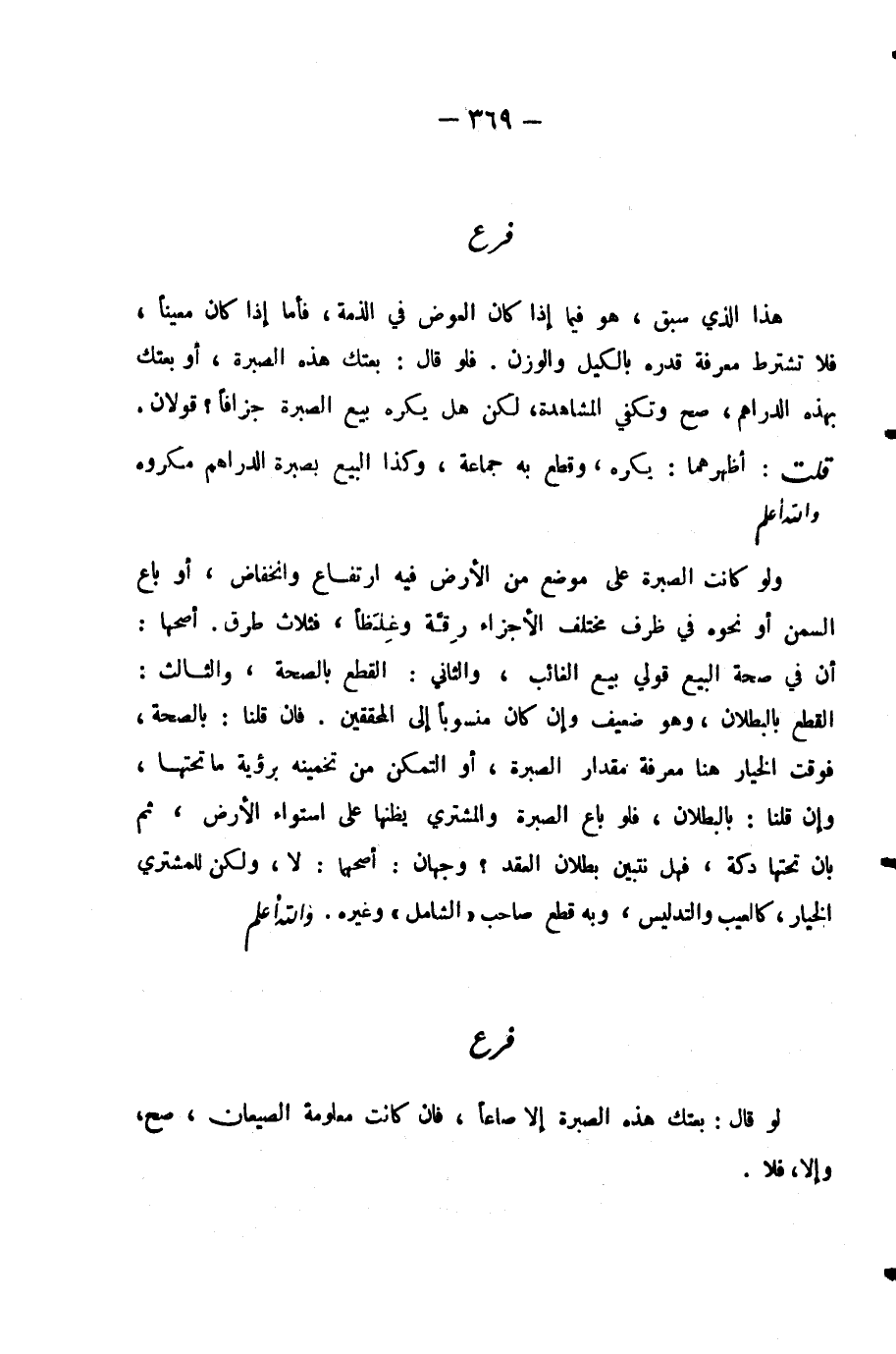 هَذَا الَّذِي سَبَقَ، هُوَ فِيمَا إِذَا كَانَ الْعِوَضُ فِي الذِّمَّةِ، فَأَمَّا إِذَا كَانَ مُعَيَّنًا، فَلَا تُشْتَرَطُ مَعْرِفَةُ قَدْرِهِ بِالْكَيْلِ وَالْوَزْنِ. فَلَوْ قَالَ: بِعْتُكَ هَذِهِ الصُّبْرَةَ، أَوْ بِعْتُكَ بِهَذِهِ الدَّرَاهِمِ، صَحَّ وَتَكْفِي الْمُشَاهَدَةُ، لَكِنْ هَلْ يُكْرَهُ بَيْعُ الصُّبْرَةِ جُزَافًا؟ قَوْلَانِ.
