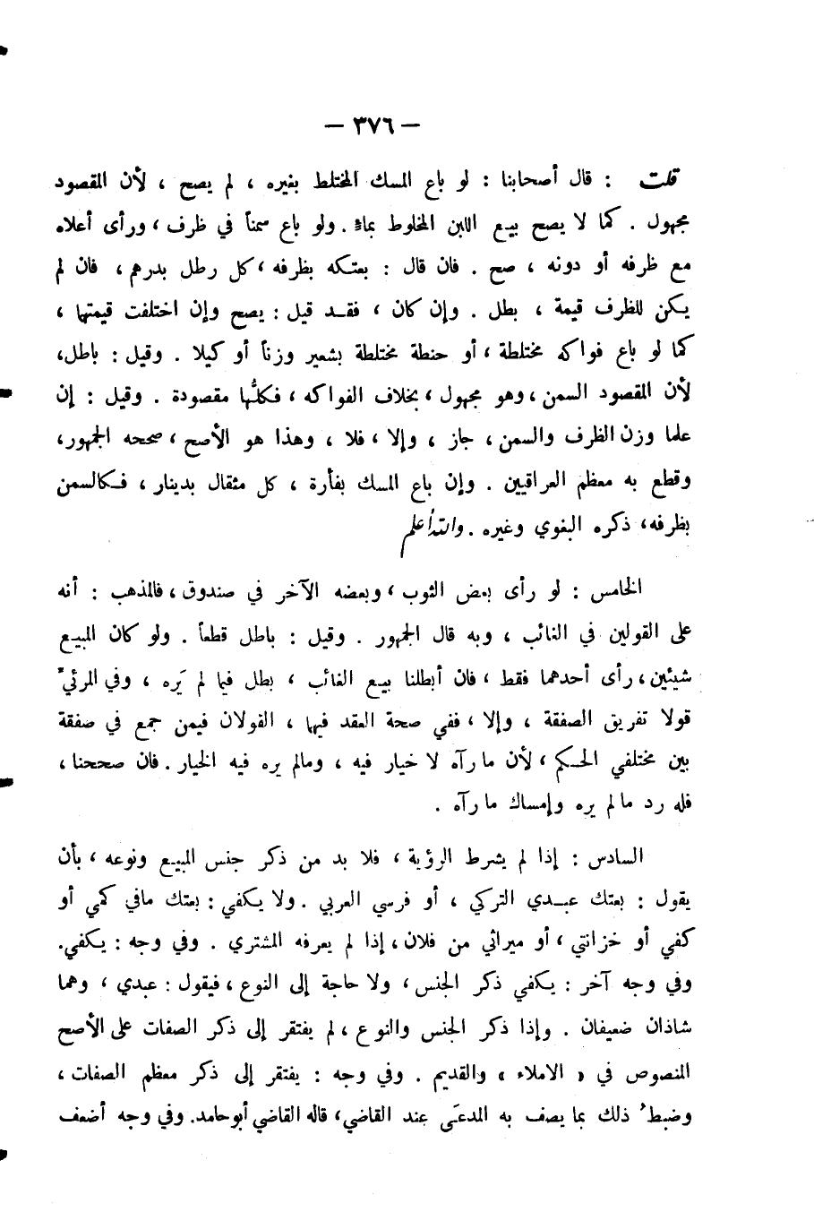 قُلْتُ: قَالَ أَصْحَابُنَا: لَوْ بَاعَ الْمِسْكَ الْمُخْتَلِطَ بِغَيْرِهِ، لَمْ يَصِحَّ؛ لِأَنَّ الْمَقْصُودَ مَجْهُولٌ. كَمَا لَا يَصِحُّ بَيْعُ اللَّبَنِ الْمَخْلُوطِ بِمَاءٍ. وَلَوْ بَاعَ سَمْنًا فِي ظَرْفٍ، وَرَأَى أَعْلَاهُ مَعَ ظَرْفِهِ أَوْ دُونَهُ، صَحَّ. فَإِنْ قَالَ: بِعْتُكَهُ بِظَرْفِهِ، كُلُّ رَطْلٍ بِدِرْهَمٍ، فَإِنْ لَمْ يَكُنْ لِلظَّرْفِ قِيمَةٌ، بَطَلَ. وَإِنْ كَانَ، فَقَدْ قِيلَ: يَصِحُّ وَإِنِ اخْتَلَفَتْ قِيمَتُهُمَا، كَمَا لَوْ بَاعَ فَوَاكِهَ مُخْتَلِطَةً، أَوْ حِنْطَةً مُخْتَلِطَةً بِشَعِيرٍ وَزْنًا أَوْ كَيْلًا. وَقِيلَ: بَاطِلٌ؛ لِأَنَّ الْمَقْصُودَ السَّمْنُ، وَهُوَ مَجْهُولٌ، بِخِلَافِ الْفَوَاكِهِ، فَكُلُّهَا مَقْصُودَةٌ. وَقِيلَ: إِنْ عَلِمَا وَزْنَ الظَّرْفِ وَالسَّمْنِ، جَازَ، وَإِلَّا، فَلَا، وَهَذَا هُوَ الْأَصَحُّ، صَحَّحَهُ الْجُمْهُورُ، وَقَطَعَ بِهِ مُعْظَمُ الْعِرَاقِيِّينَ. وَإِنْ بَاعَ الْمِسْكَ بِفَأْرَةٍ، كُلُّ مِثْقَالٍ بِدِينَارٍ، فَكَالسَّمْنِ بِظَرْفِهِ، ذَكَرَهُ الْبَغَوِيُّ وَغَيْرُهُ. وَاللَّهُ أَعْلَمُ.