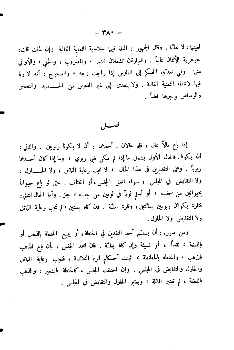 وَمِنْ صُوَرِهِ: أَنْ يُسَلِّمَ أَحَدَ النَّقْدَيْنِ فِي الْحِنْطَةِ، أَوْ يَبِيعَ الْحِنْطَةَ بِالذَّهَبِ أَوْ بِالْفِضَّةِ، نَقْدًا، أَوْ نَسِيئَةً وَإِنْ كَانَا بِعِلَّةٍ. فَإِنِ اتَّحَدَ الْجِنْسُ، بِأَنْ بَاعَ الذَّهَبَ بِالذَّهَبِ، وَالْحِنْطَةَ بِالْحِنْطَةِ، ثَبَتَتْ أَحْكَامُ الرِّبَا الثَّلَاثَةُ، فَتَجِبُ رِعَايَةُ التَّمَاثُلِ وَالْحُلُولِ وَالتَّقَابُضِ فِي الْمَجْلِسِ. وَإِنِ اخْتَلَفَ الْجِنْسُ، كَالْحِنْطَةِ بِالشَّعِيرِ، وَالذَّهَبِ بِالْفِضَّةِ، لَمْ تُعْتَبَرِ الْمُمَاثَلَةُ، وَيُعْتَبَرُ الْحُلُولُ وَالتَّقَابُضُ فِي الْمَجْلِسِ.